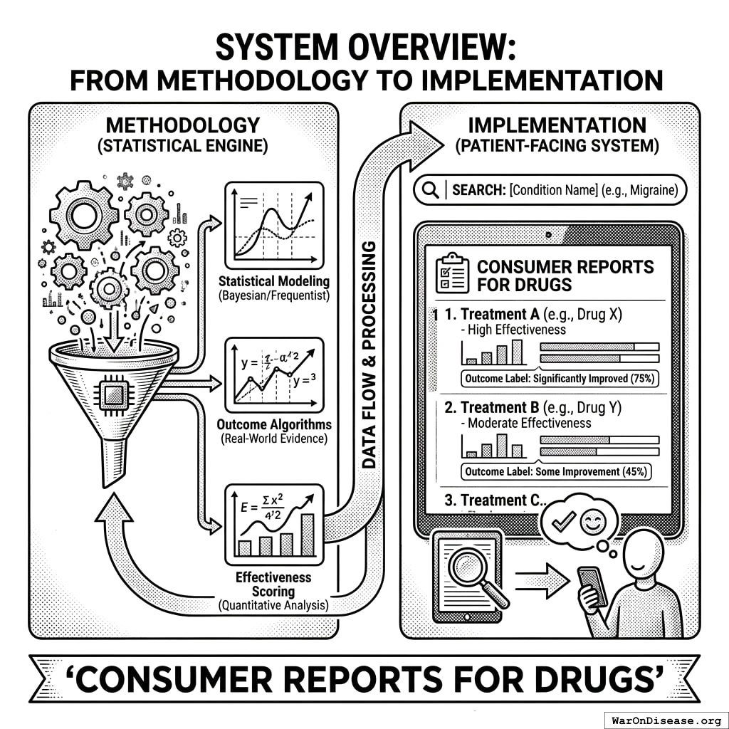 This paper describes the statistical methodology powering a patient-facing system best understood as “Consumer Reports for drugs” - a searchable database where patients can look up any condition and see every treatment ranked by real-world effectiveness, with quantitative outcome labels showing exactly what happened to people who tried each option.