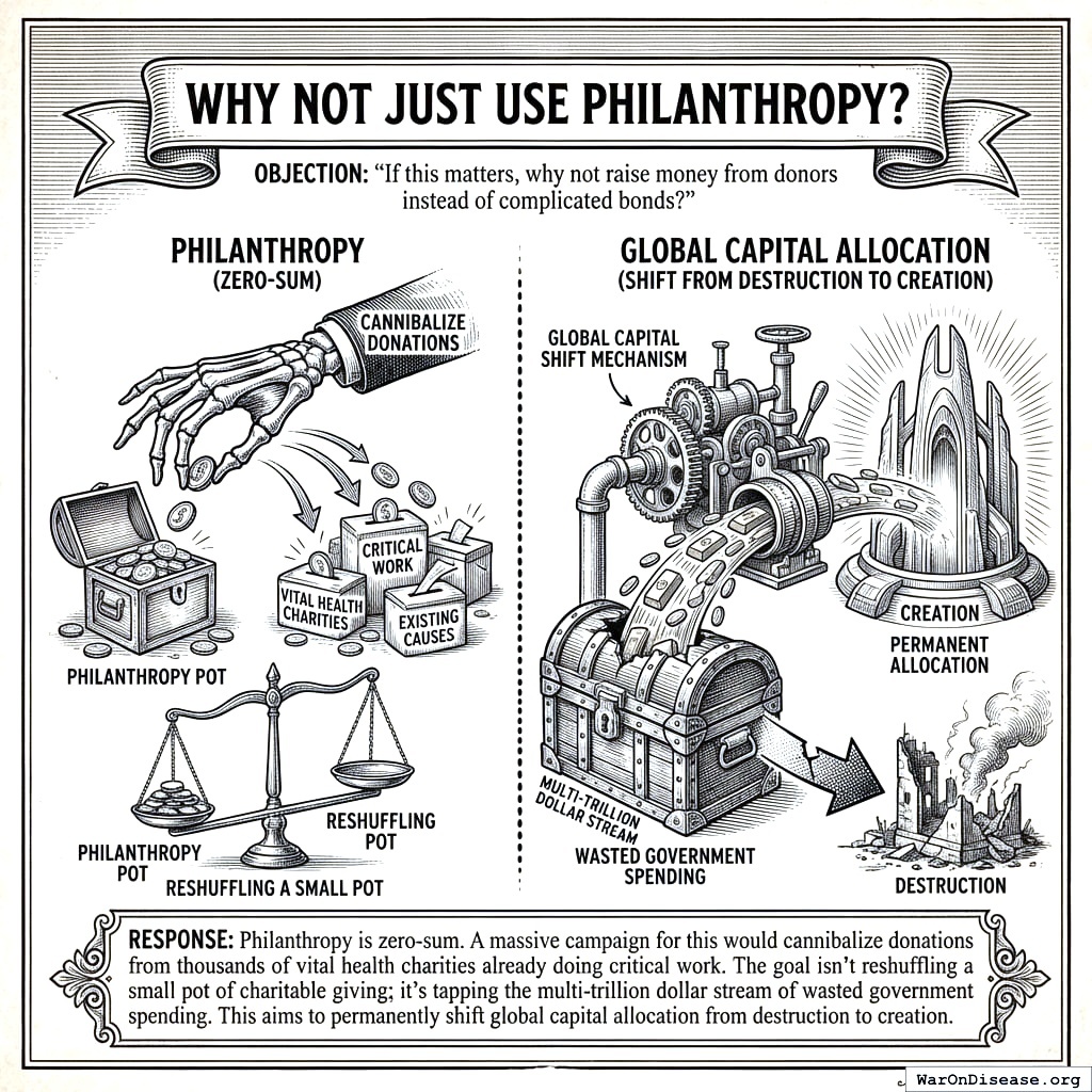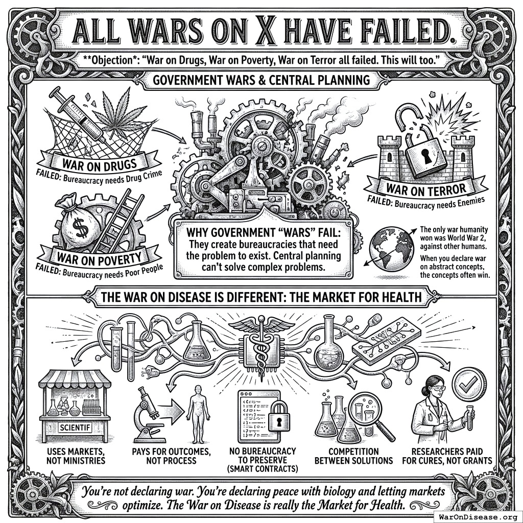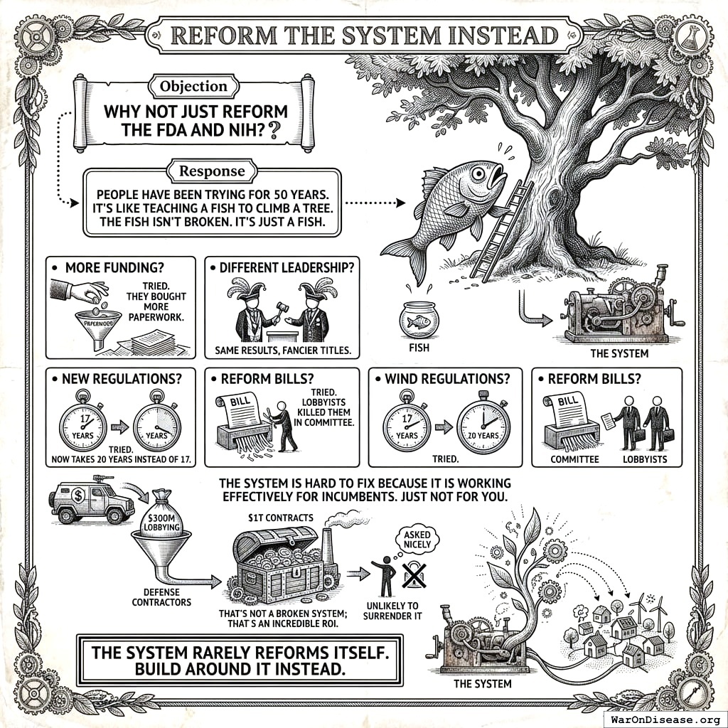 Under this system, trials become revenue instead of cost. You’re offering the casino a guaranteed salary. Casinos love guaranteed salaries. They’d trample each other getting to the signing ceremony. The only reason pharma “profits from disease” is because you built a system where curing disease is a financial risk. Remove the risk and they’ll cure things faster than you can name them. They’re not evil. They’re just doing math. Change the math.