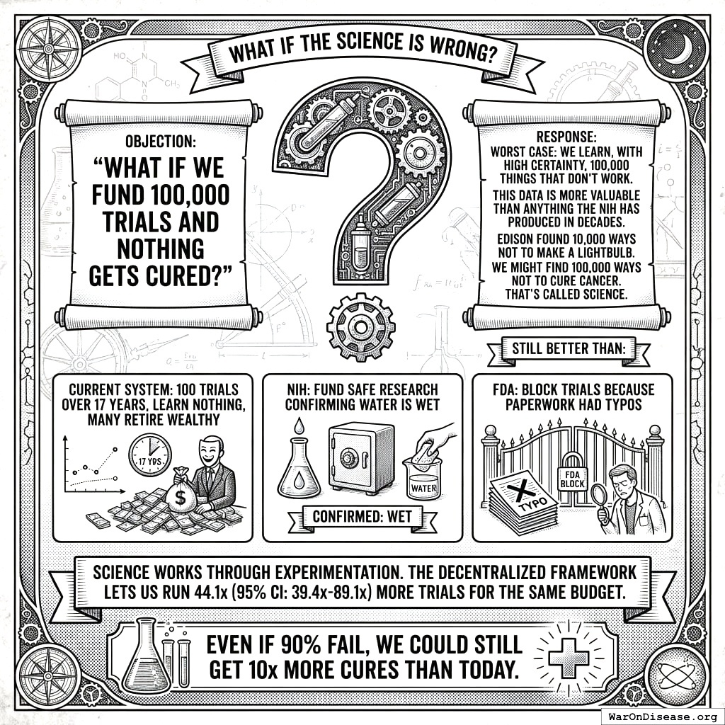 Pharma currently pays $2.6 billion (95% CI: $1.5 billion-$4 billion) per drug. 90% fail. This is called “drug development.” On Wishonia, we have a different word for spending billions with a 10% success rate. We call it “gambling.”