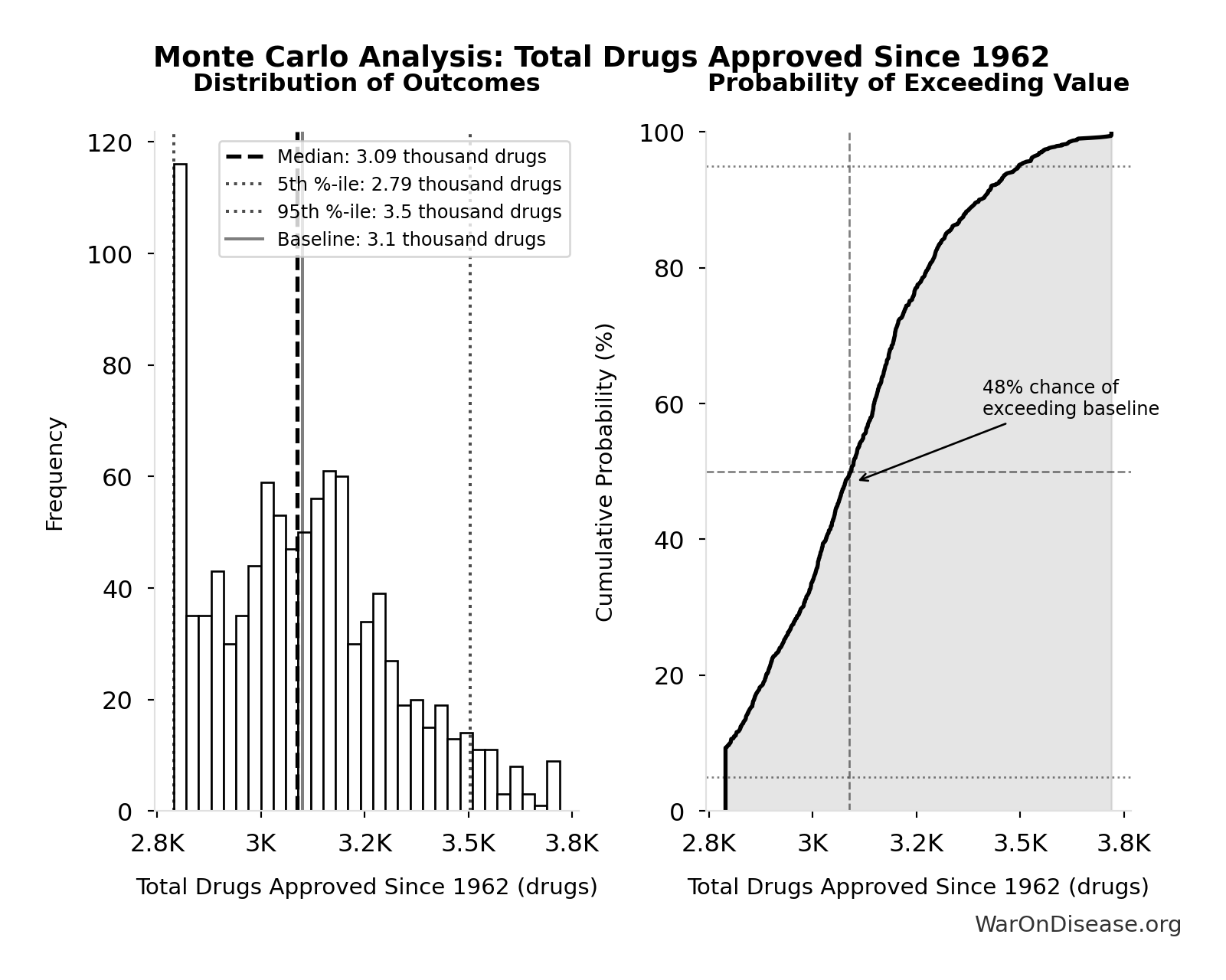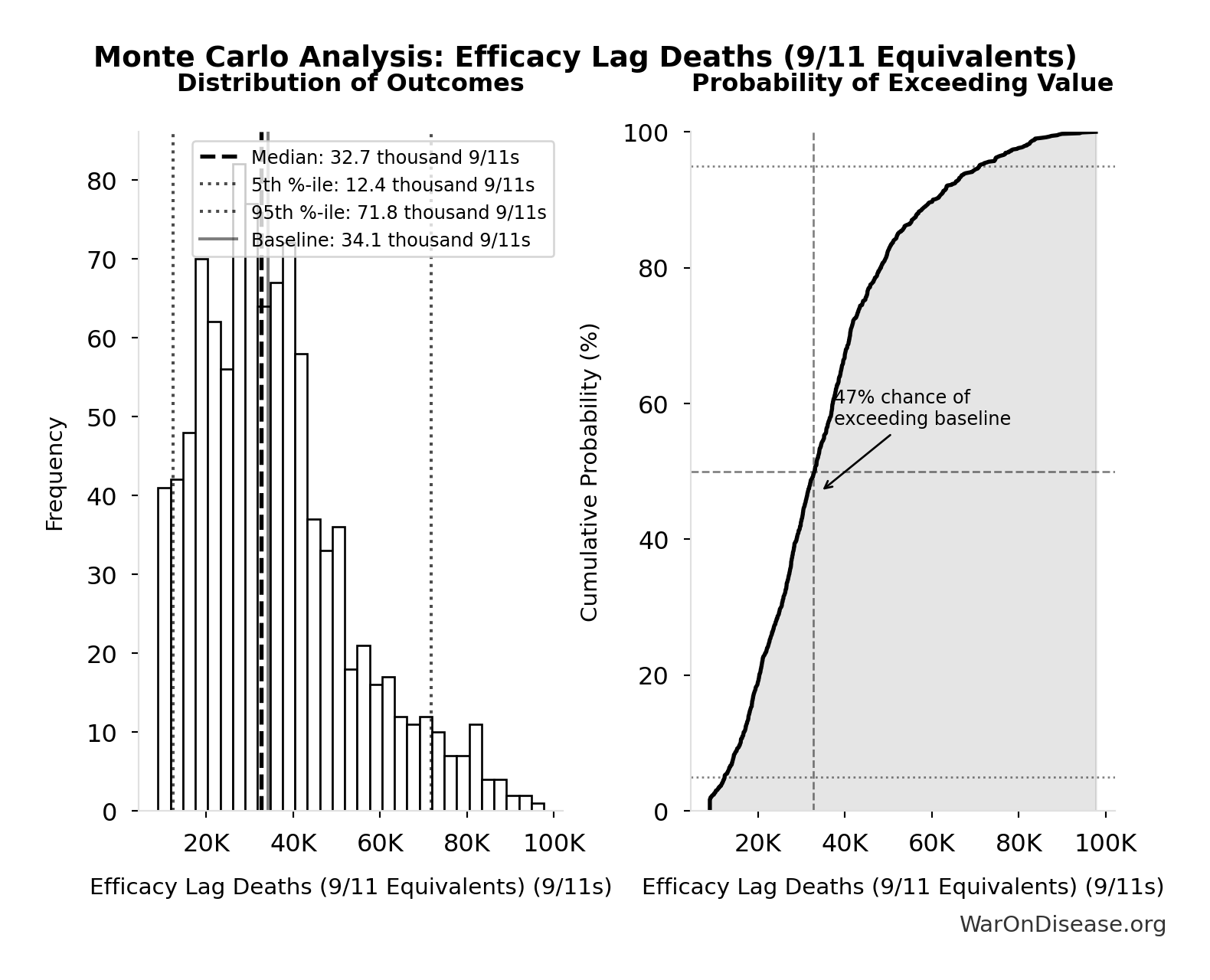 The histogram shows the distribution of Total Deaths from Disease Eradication Delay across 10,000 Monte Carlo simulations. The CDF (right) shows the probability of the outcome exceeding any given value, which is useful for risk assessment.