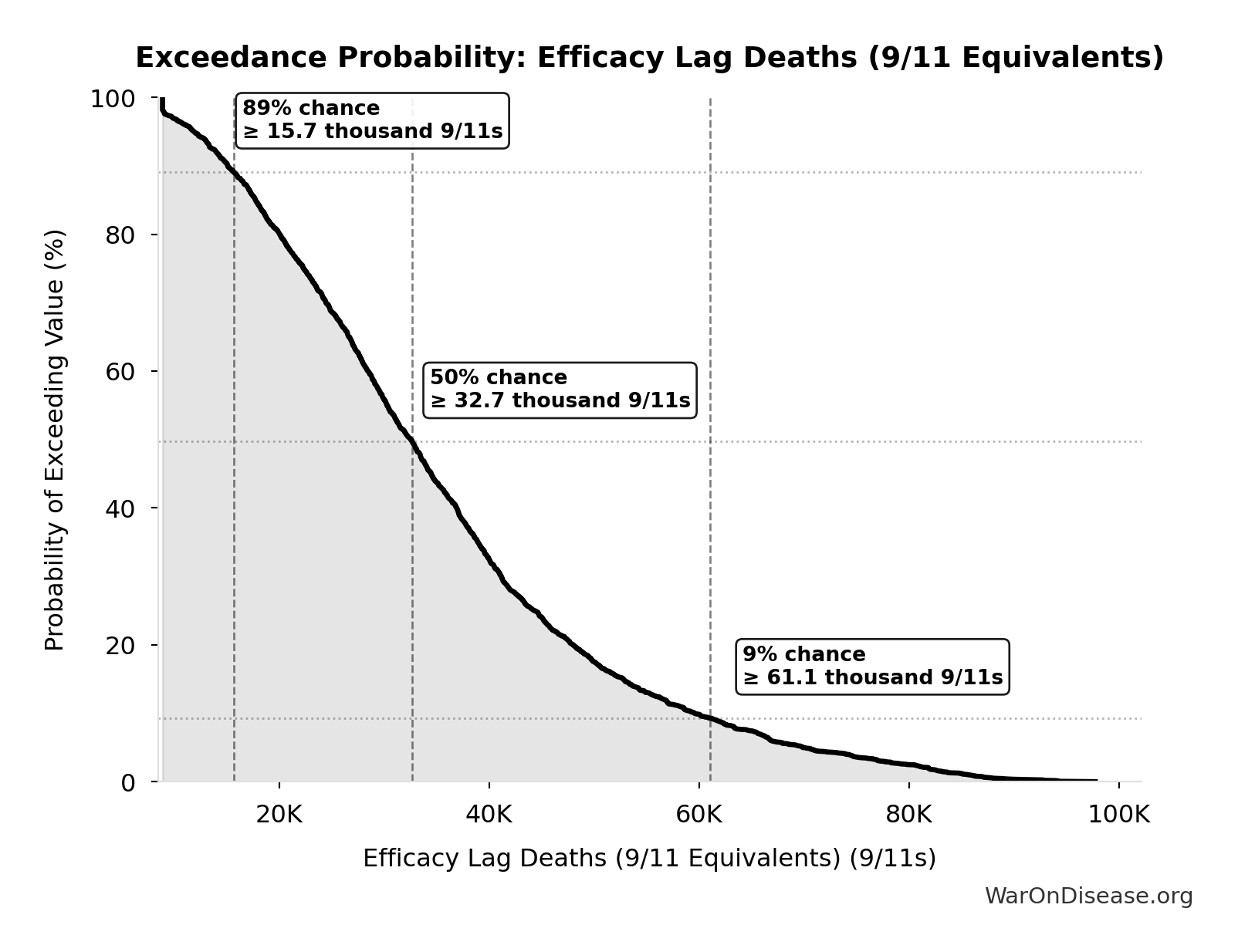 This exceedance probability chart shows the likelihood that Total Deaths from Disease Eradication Delay will exceed any given threshold. Higher curves indicate more favorable outcomes with greater certainty.