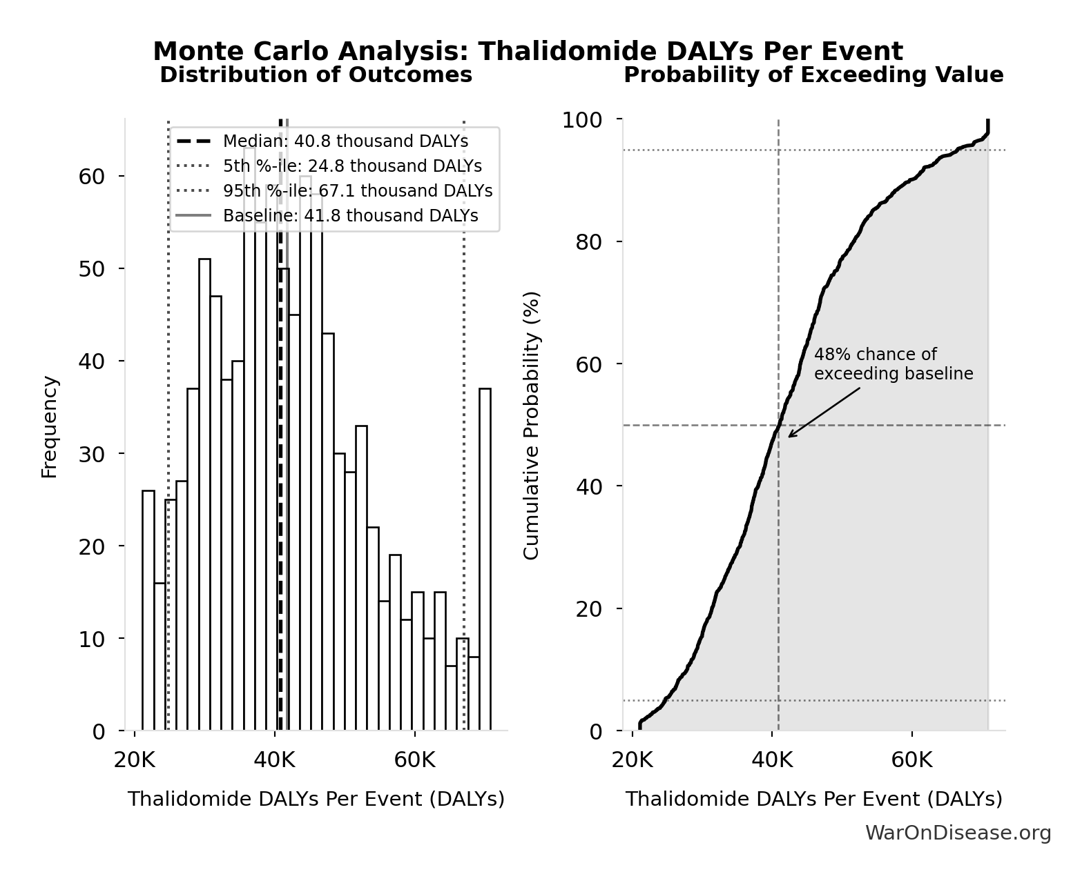 The histogram shows the distribution of Total DALYs Lost from Disease Eradication Delay across 10,000 Monte Carlo simulations. The CDF (right) shows the probability of the outcome exceeding any given value, which is useful for risk assessment.