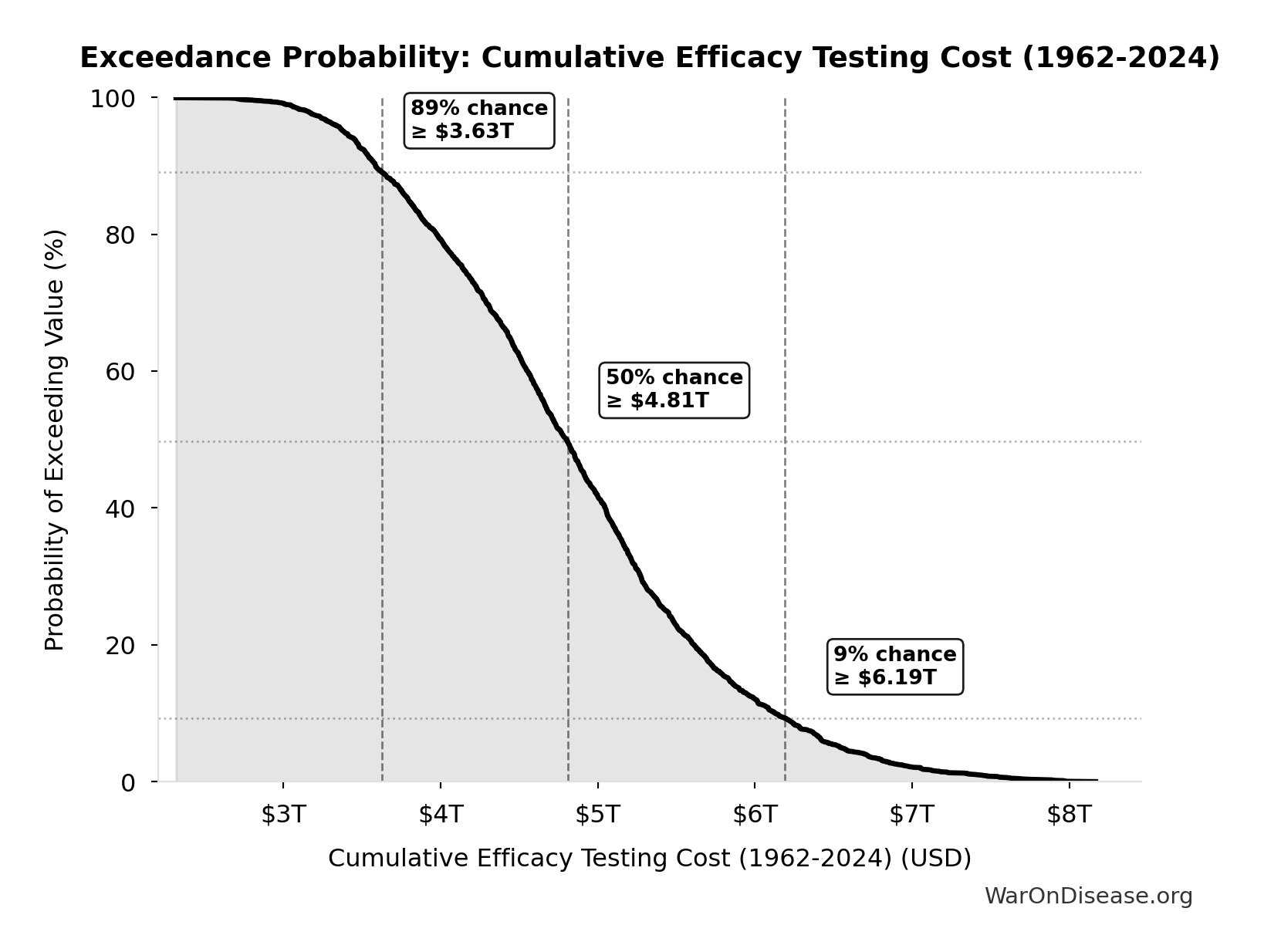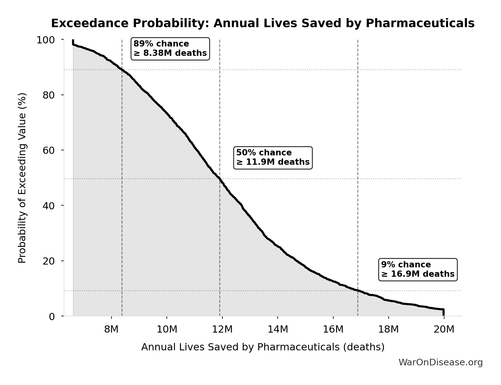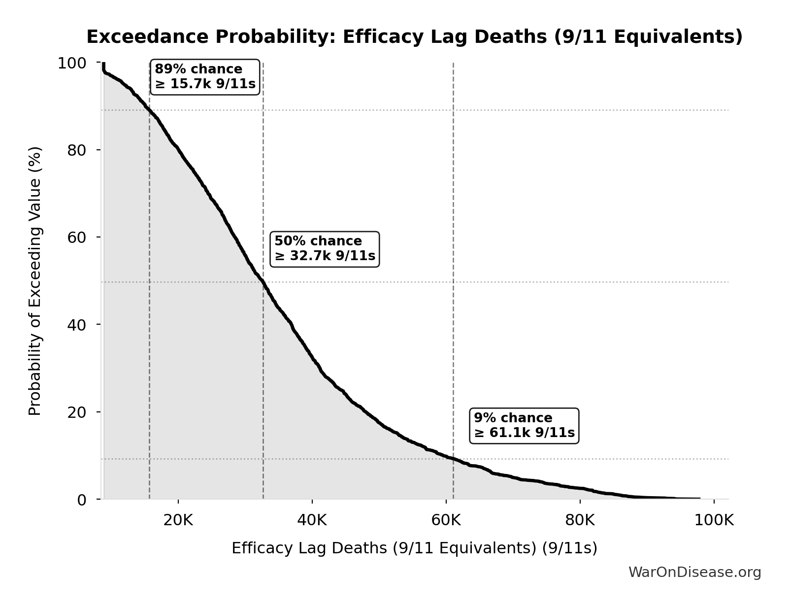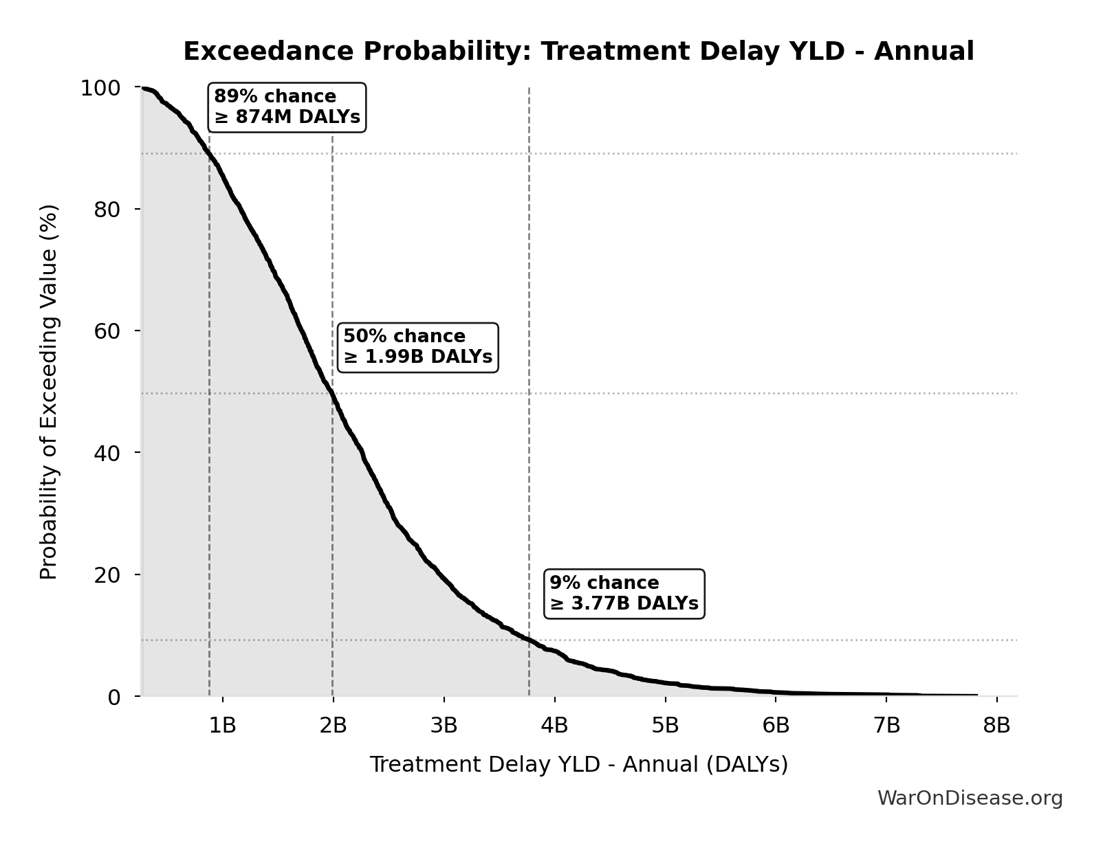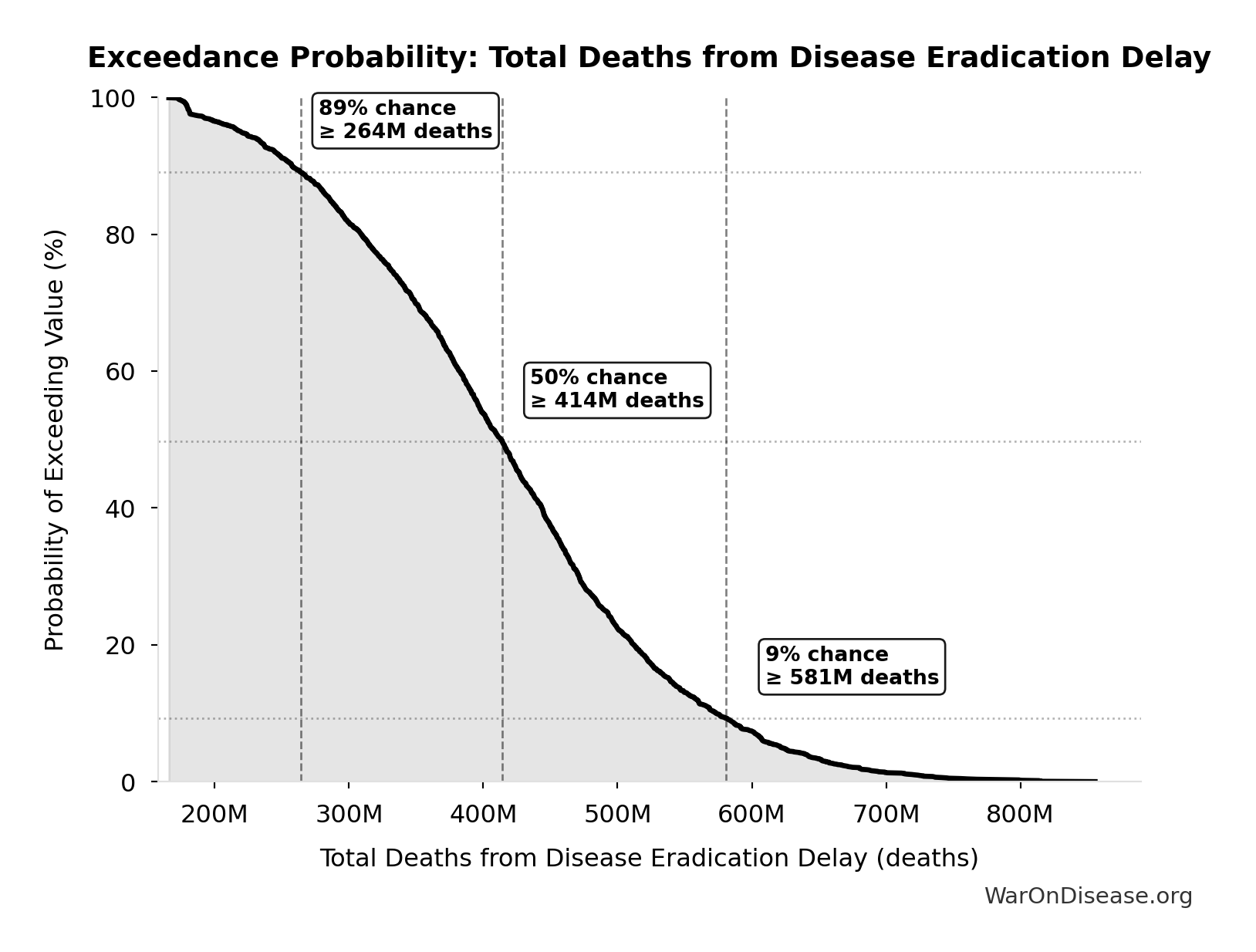 This exceedance probability chart shows the likelihood that Total Deaths from Disease Eradication Delay will exceed any given threshold. Higher curves indicate more favorable outcomes with greater certainty.