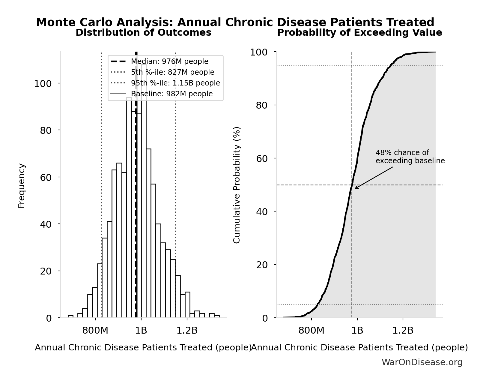 The histogram shows the distribution of Annual Chronic Disease Patients Treated across 10,000 Monte Carlo simulations. The CDF (right) shows the probability of the outcome exceeding any given value, which is useful for risk assessment.
