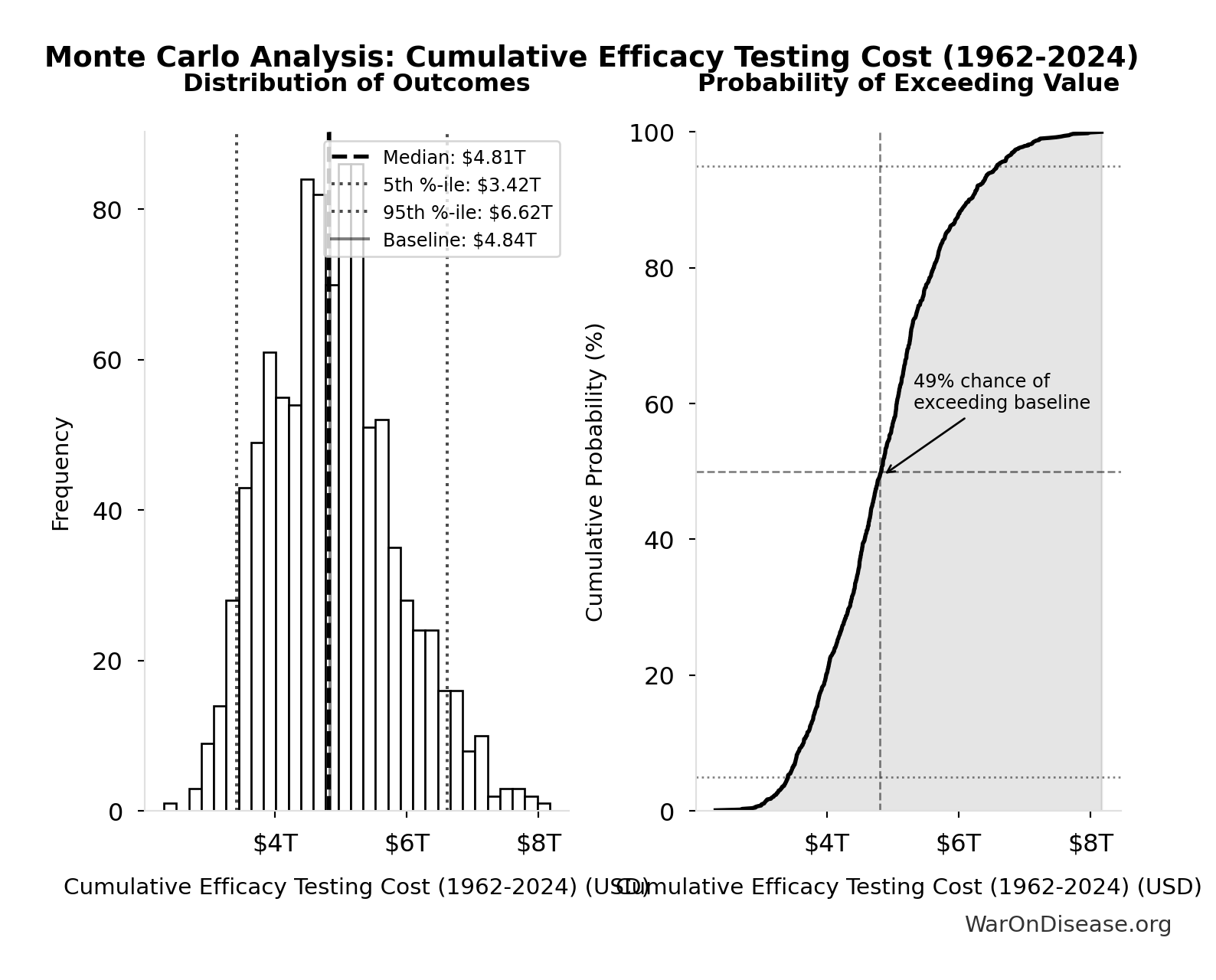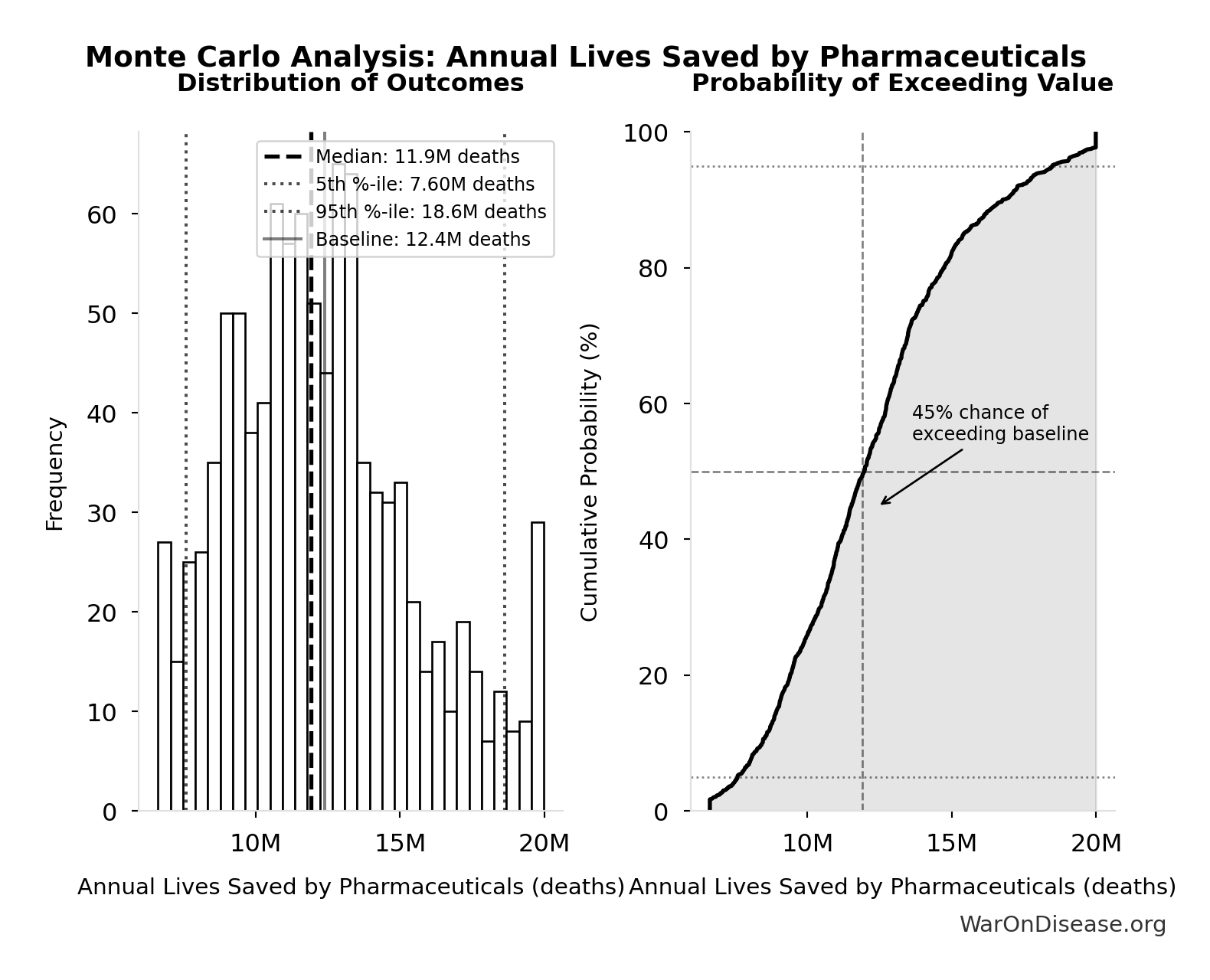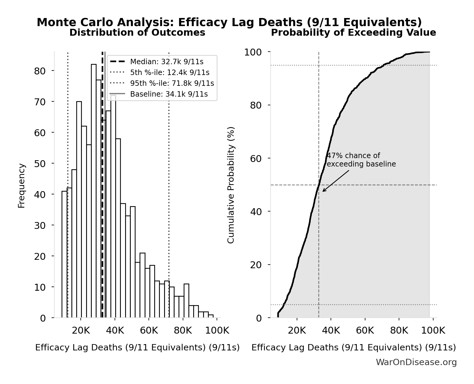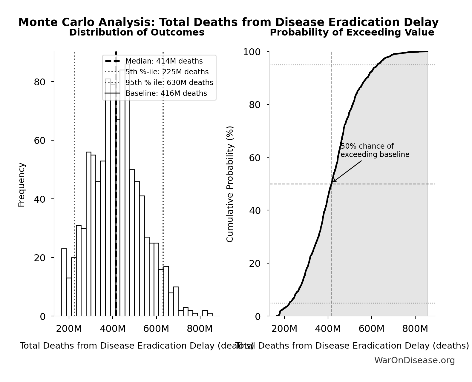 The histogram shows the distribution of Total Deaths from Disease Eradication Delay across 10,000 Monte Carlo simulations. The CDF (right) shows the probability of the outcome exceeding any given value, which is useful for risk assessment.