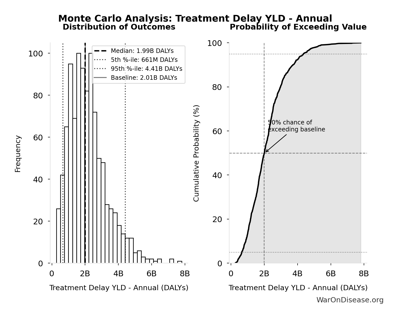 The histogram shows the distribution of Total DALYs Lost from Disease Eradication Delay across 10,000 Monte Carlo simulations. The CDF (right) shows the probability of the outcome exceeding any given value, which is useful for risk assessment.