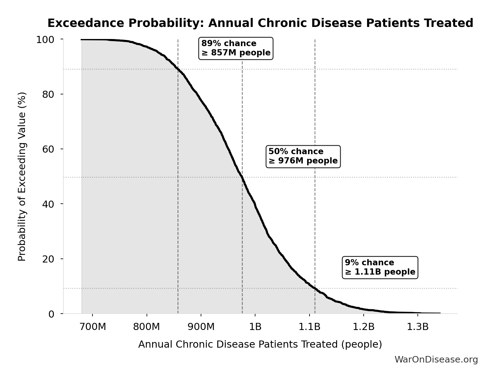 This exceedance probability chart shows the likelihood that Annual Chronic Disease Patients Treated will exceed any given threshold. Higher curves indicate more favorable outcomes with greater certainty.