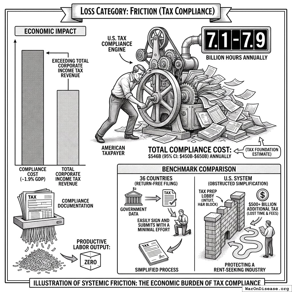 Private sector resources consumed by government-imposed compliance requirements. Tax compliance costs $546 billion (95% CI: $450 billion-$650 billion) annually. This is not federal spending. The total includes 7.9 billion hours of lost productivity plus out-of-pocket filing costs. Regulatory red tape adds $580 billion (95% CI: $290 billion-$1 trillion) in procedural friction without corresponding safety benefits.