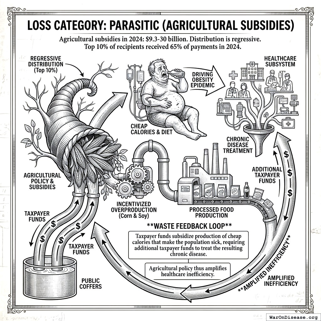 Actual budget allocations flowing to low-value uses. This is traditional “government waste”: military overspend, corporate welfare, drug war enforcement, fossil fuel subsidies, agricultural subsidies. The solution is budget reallocation-redirect these dollars to higher-return uses without increasing total spending.