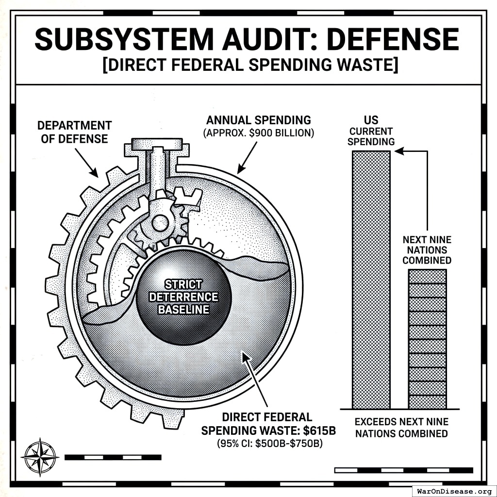 Think of military spending: the $615 billion (95% CI: $500 billion-$750 billion) “overspend” above strict deterrence baseline represents federal dollars that could fund disease eradication treaties instead of maintaining 750 overseas bases150.