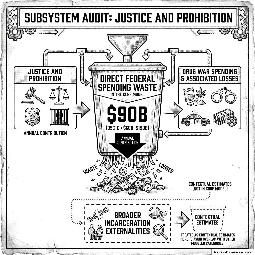 Methodological Note: Subsystem losses are estimated independently and treated as additive. While some overlap may exist (e.g., housing costs affect health via stress, incarceration overlaps with drug enforcement), excluded categories (state/local inefficiency, implicit subsidies, behavioral effects) likely offset any potential overstatement.