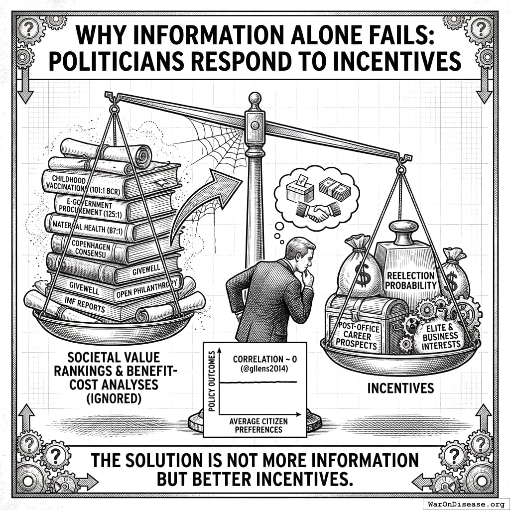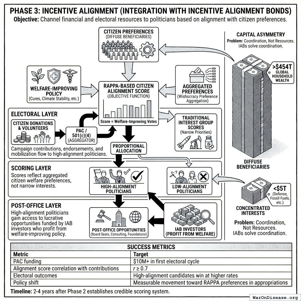 Politicians currently face incentives that reward serving concentrated interests (weapons manufacturers, pharmaceutical incumbents, fossil fuel producers) at the expense of diffuse beneficiaries (citizens who would benefit from cures, climate stability, reduced existential risk). IABs flip this calculus by making the diffuse beneficiaries’ preferences financially consequential.