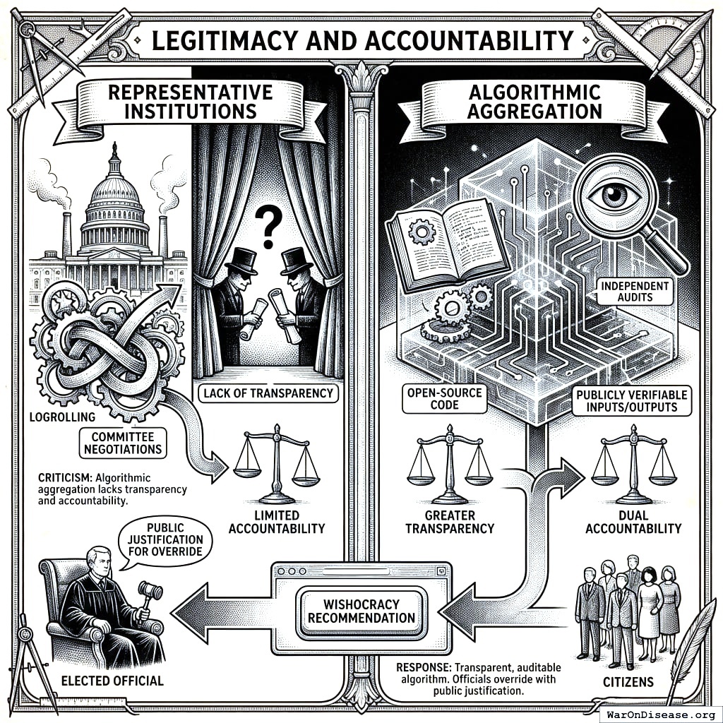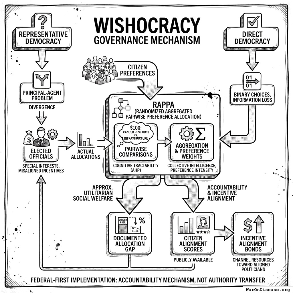 Representative democracy suffers from a fundamental principal-agent problem: elected officials systematically diverge from citizen preferences due to information asymmetry, special interest capture, and misaligned incentives. Meanwhile, direct democracy mechanisms reduce complex trade-offs to binary choices, losing crucial information about preference intensity. This paper introduces Wishocracy, a governance mechanism that addresses the democratic principal-agent problem by aggregating citizen preferences and creating accountability for elected representatives. The mechanism employs Randomized Aggregated Pairwise Preference Allocation (RAPPA), which presents participants with simple pairwise comparisons (‘allocate $100 between cancer research and infrastructure’) and aggregates millions of such judgments into preference weights that approximate utilitarian social welfare. Building on the Analytic Hierarchy Process146 for cognitive tractability and collective intelligence research14 for aggregation, RAPPA decomposes n-dimensional preference spaces into tractable binary choices while preserving preference intensity information. We present formal mechanism properties, computational complexity analysis, and empirical precedents from Porto Alegre’s participatory budgeting, Taiwan’s vTaiwan platform, and Stanford’s voting research. Rather than replacing representative democracy at the municipal level, we propose a federal-first implementation: (1) documenting the gap between citizen preferences and actual federal allocations, (2) creating public “Citizen Alignment Scores” for elected officials, and (3) integrating with Incentive Alignment Bonds147 to channel electoral and financial resources toward politicians whose voting records align with aggregated citizen preferences. This approach treats Wishocracy as an accountability mechanism that makes representative democracy work better, requiring no authority transfer, only information provision and incentive alignment.