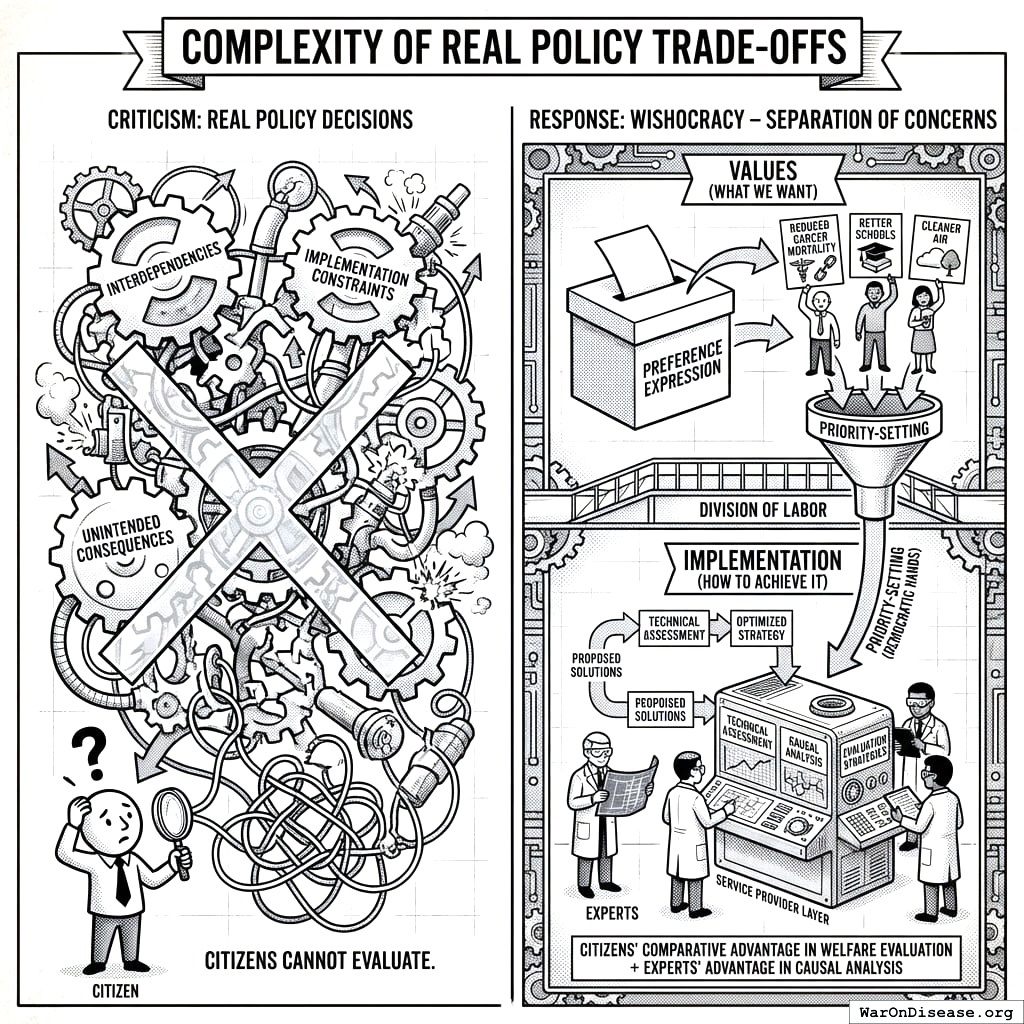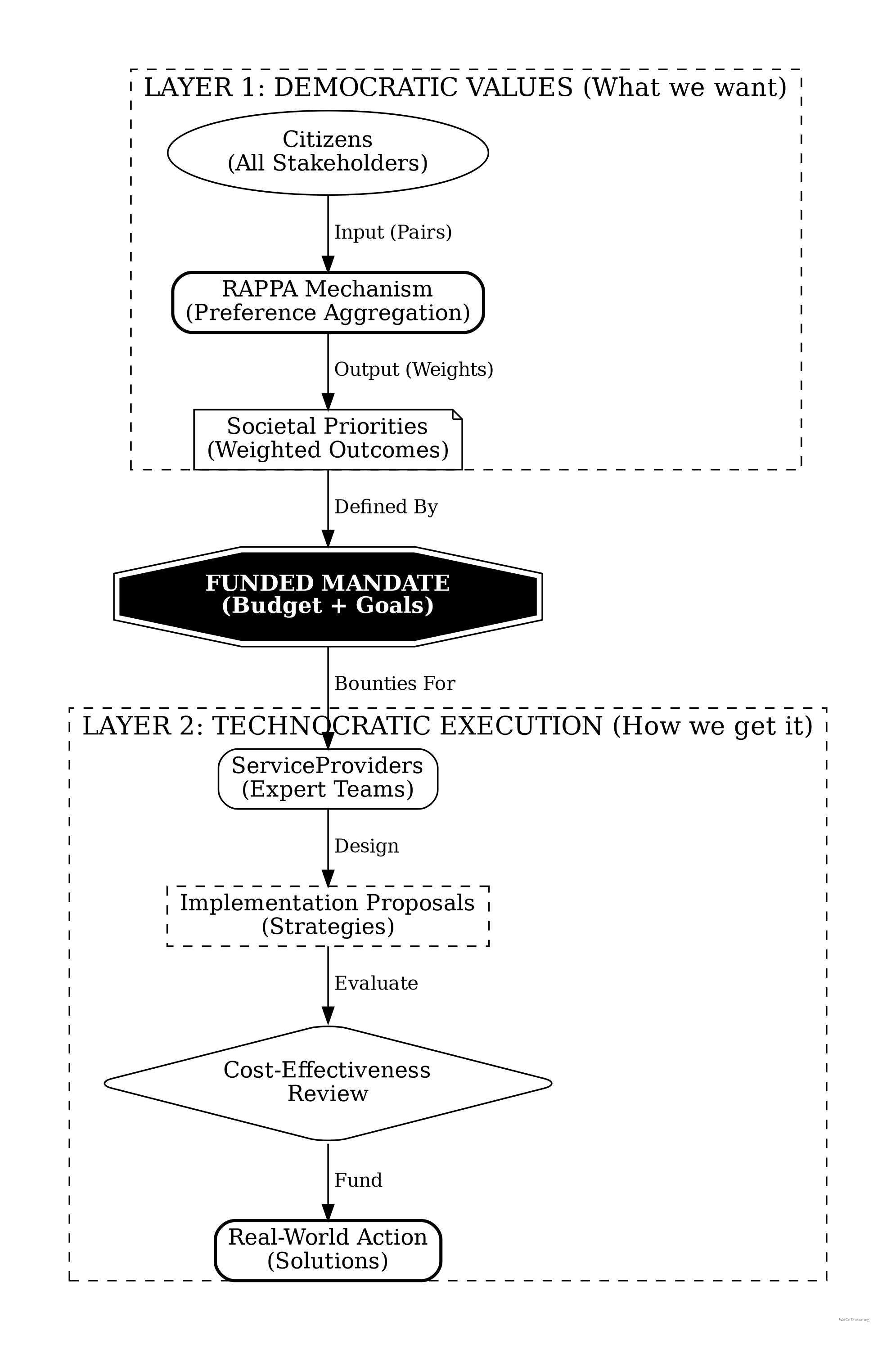 This separation addresses a key criticism of technocracy (experts shouldn’t determine societal values) while respecting the limits of direct democracy (citizens cannot evaluate complex implementation trade-offs). Each layer operates where its participants have comparative advantage: citizens in welfare evaluation, experts in causal analysis.