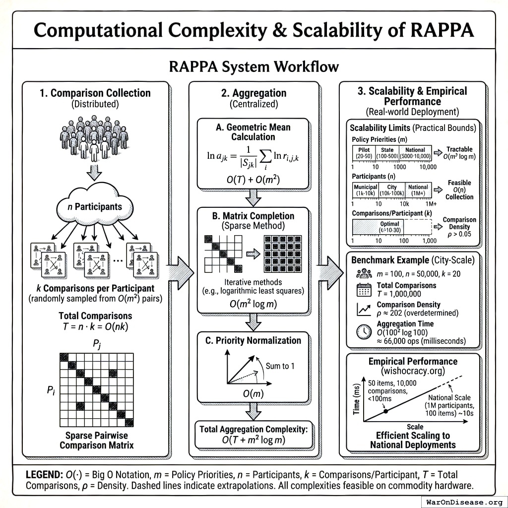Comparison Collection Complexity: For \(m\) policy priorities, the complete pairwise comparison space contains \(\binom{m}{2} = \frac{m(m-1)}{2} = O(m^2)\) unique pairs. However, RAPPA employs random sampling rather than exhaustive coverage. Each of \(n\) participants completes \(k\) comparisons, yielding total comparison count \(T = n \cdot k = O(nk)\). \(k\) can be held constant (e.g., \(k=20\) comparisons per participant) regardless of \(m\), making per-participant complexity \(O(1)\) rather than \(O(m^2)\).