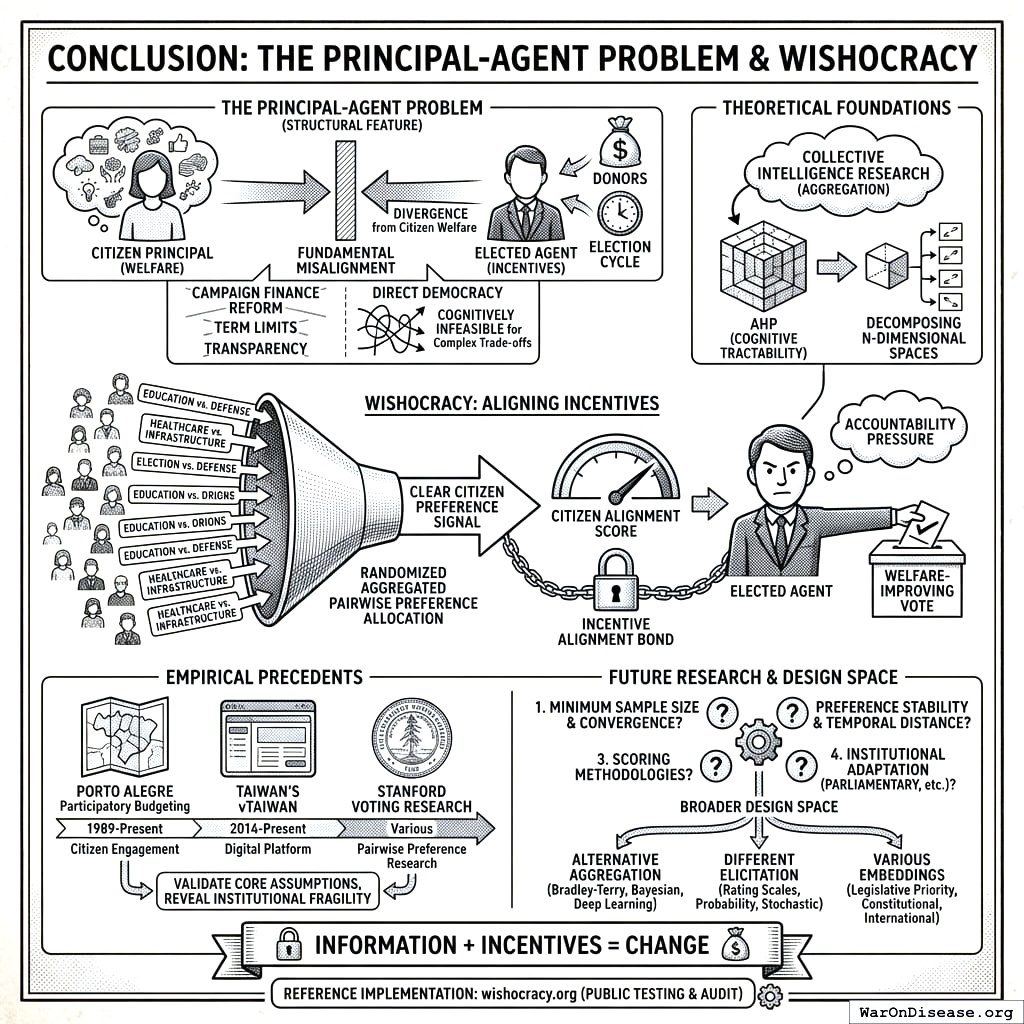 Wishocracy addresses the central failure mode of democratic governance: the principal-agent problem that corrupts representative institutions. The mechanism combines four elements: AHP’s cognitive tractability, slider-based preference intensity capture, collective intelligence aggregation, and (critically) integration with incentive mechanisms that make representatives care about alignment scores. Information alone changes nothing. Information plus incentives can change everything.