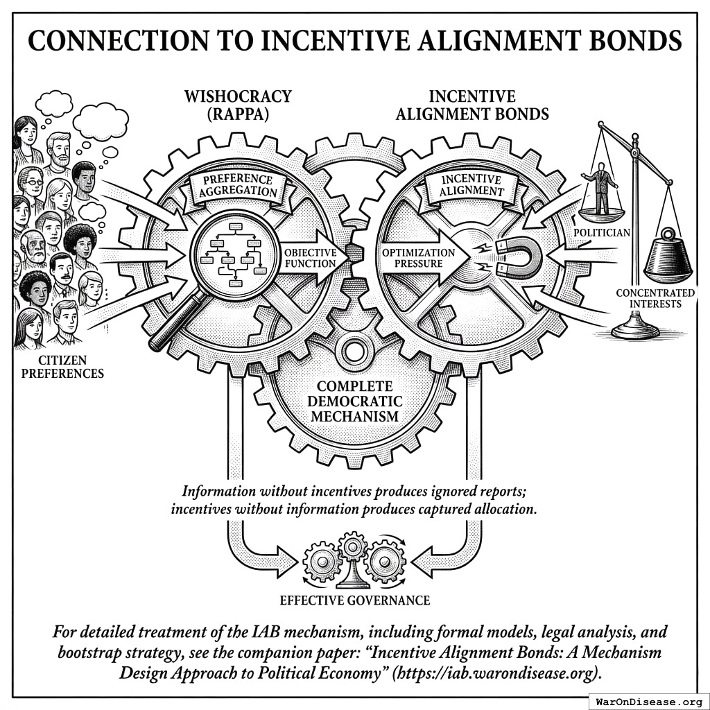 Together, they form a complete system: RAPPA provides the objective function (what to optimize for), and IABs provide the optimization pressure (why politicians should care). Neither mechanism alone is sufficient: information without incentives produces ignored reports; incentives without information produces captured allocation.