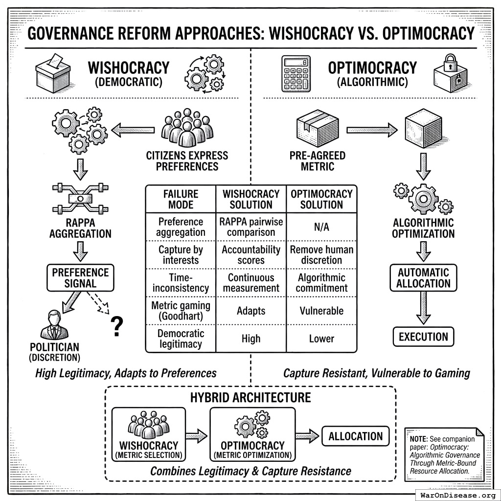 A hybrid architecture might use Wishocracy for metric selection (citizens choose what to optimize) and Optimocracy for metric optimization (algorithms allocate to maximize the chosen metric). This combines democratic legitimacy at the constitutional level with capture resistance at the execution level.