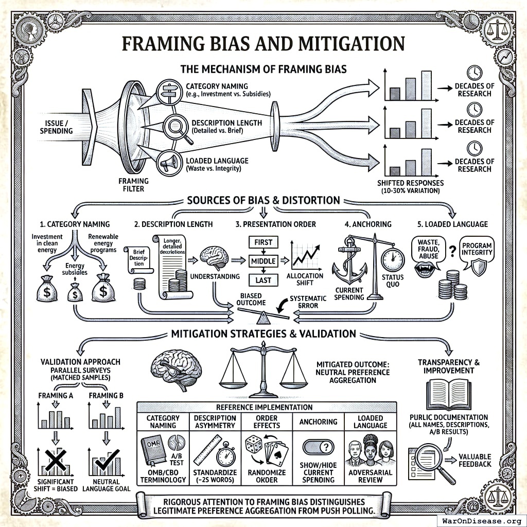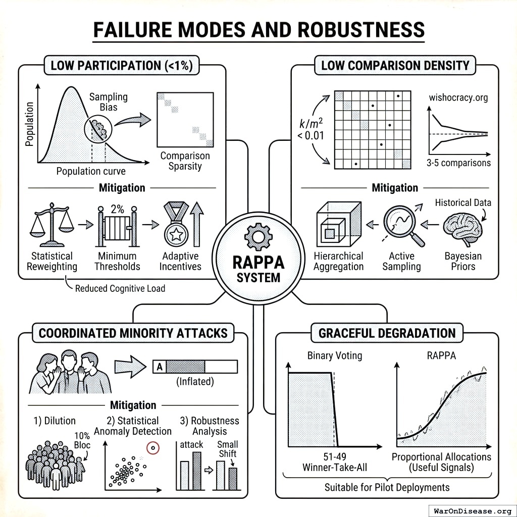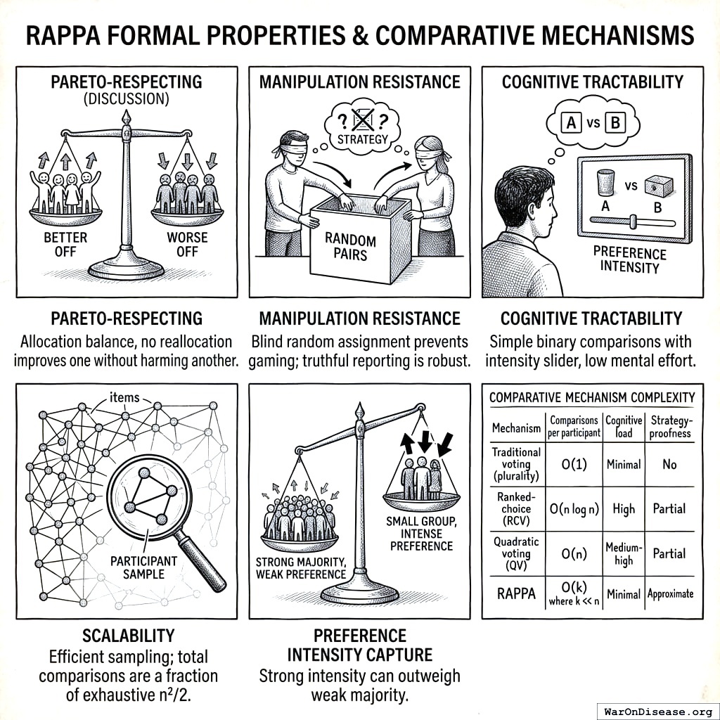 Scope Constraint (Domain Restriction): RAPPA operates over a pre-defined question domain \(\mathcal{D} \subseteq O\). Questions outside \(\mathcal{D}\) cannot appear as comparison items. This is a mechanism property, not a political choice: the system does not accept inputs outside its domain, analogous to type safety in programming languages. When \(\mathcal{D}\) is restricted to (e.g.) medical research allocation, fundamental rights questions are structurally excluded from the aggregation. This prevents the tyranny-of-majority failure mode observed in unbounded direct democracy systems such as California ballot propositions154 and Swiss referendums on minority rights155.
