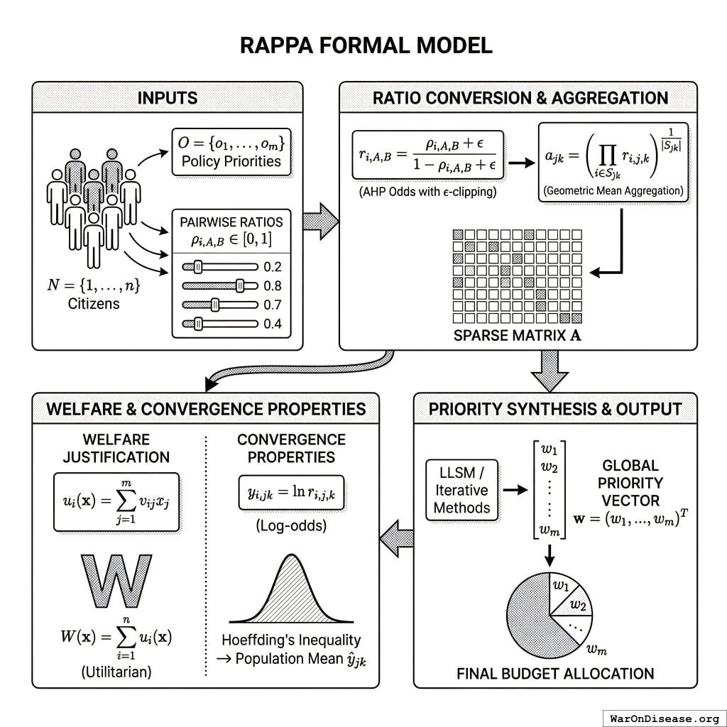 • Layer 1 (RAPPA): Democratic, values-based. “What should we do?” Citizens express preferences over outcomes (reduced cancer mortality, better schools, cleaner air) based on their welfare valuations.