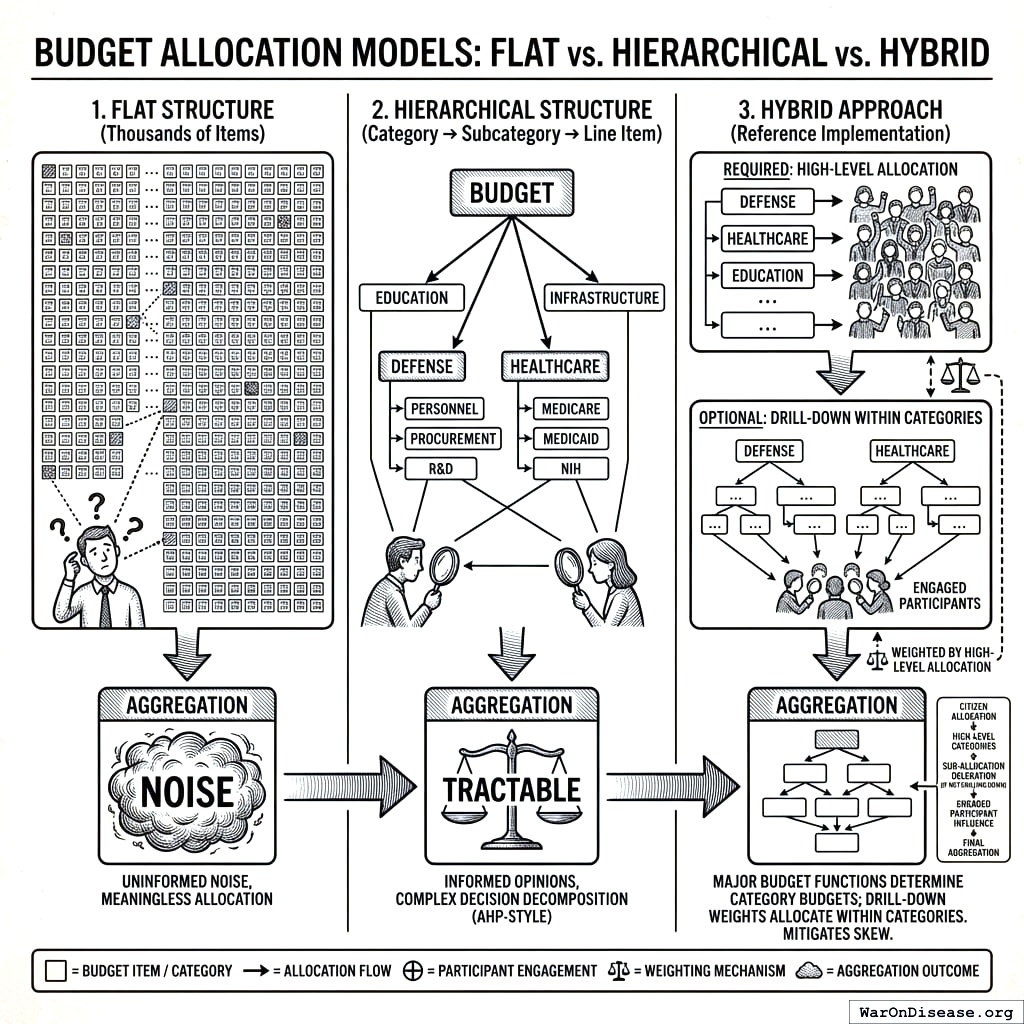 National budget priorities operate differently. Citizens have strong preferences about broad allocations: medical research versus military spending, education versus incarceration, infrastructure versus subsidies. They can make these judgments without needing neighborhood-level expertise. These are value judgments about societal priorities, not technical assessments of local conditions.