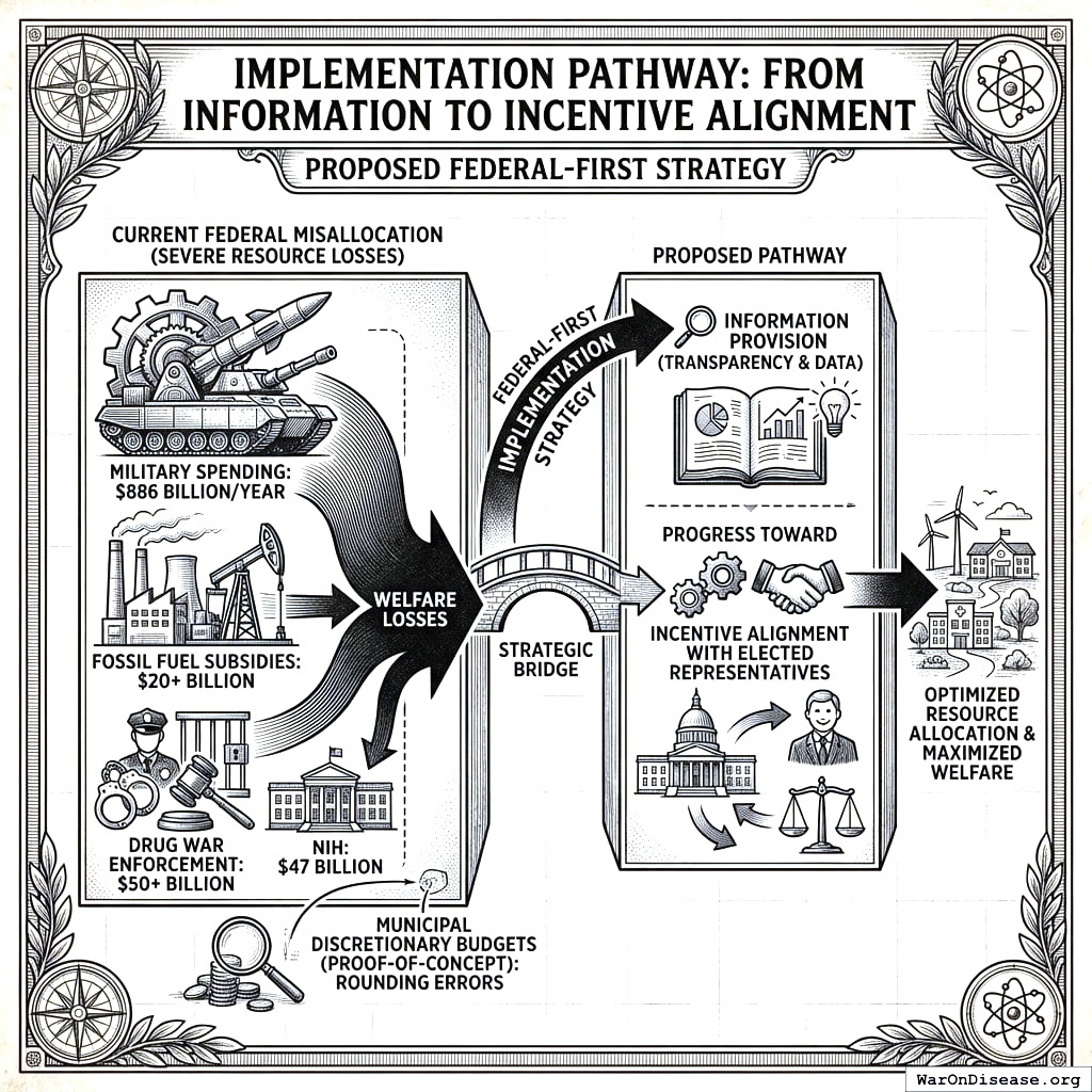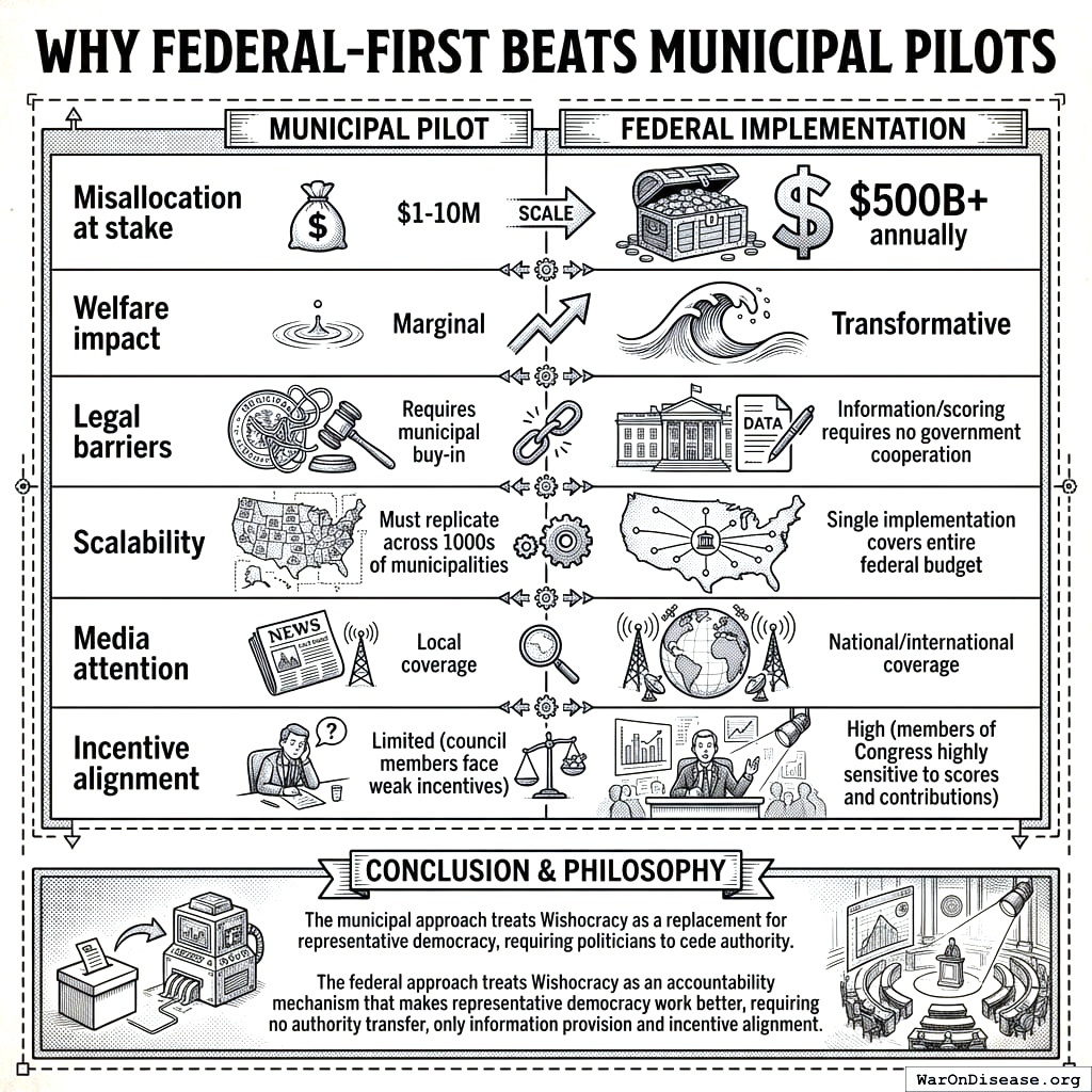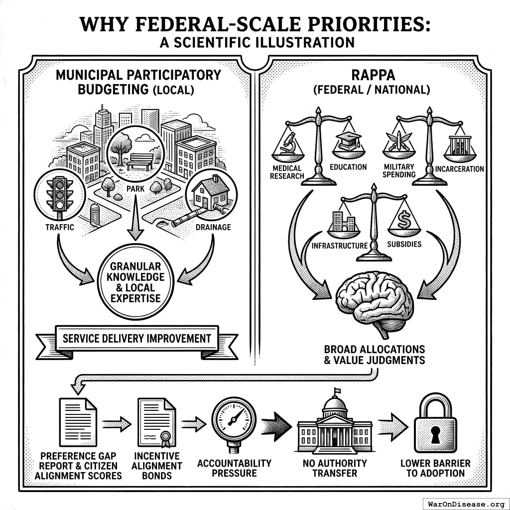 Additionally, the federal approach requires no authority transfer. Publishing a “Preference Gap Report” and Citizen Alignment Scores is pure information provision. Combined with Incentive Alignment Bonds, this creates accountability pressure without asking any politician to cede decision-making authority. This is a significantly lower barrier to adoption than municipal pilots that require city councils to delegate budget control.