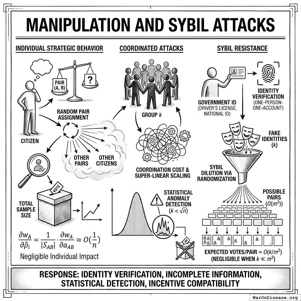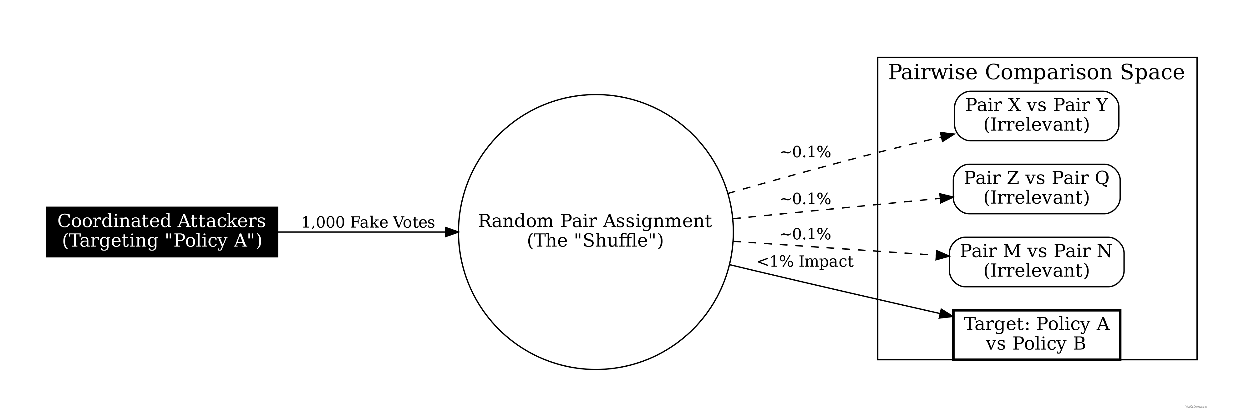 Manipulation Resistance: Random pair assignment makes strategic manipulation difficult. A participant cannot know which pairs they will receive, making truthful reporting a robust heuristic. With sufficiently large participant pools, individual strategic behavior has negligible impact on outcomes.