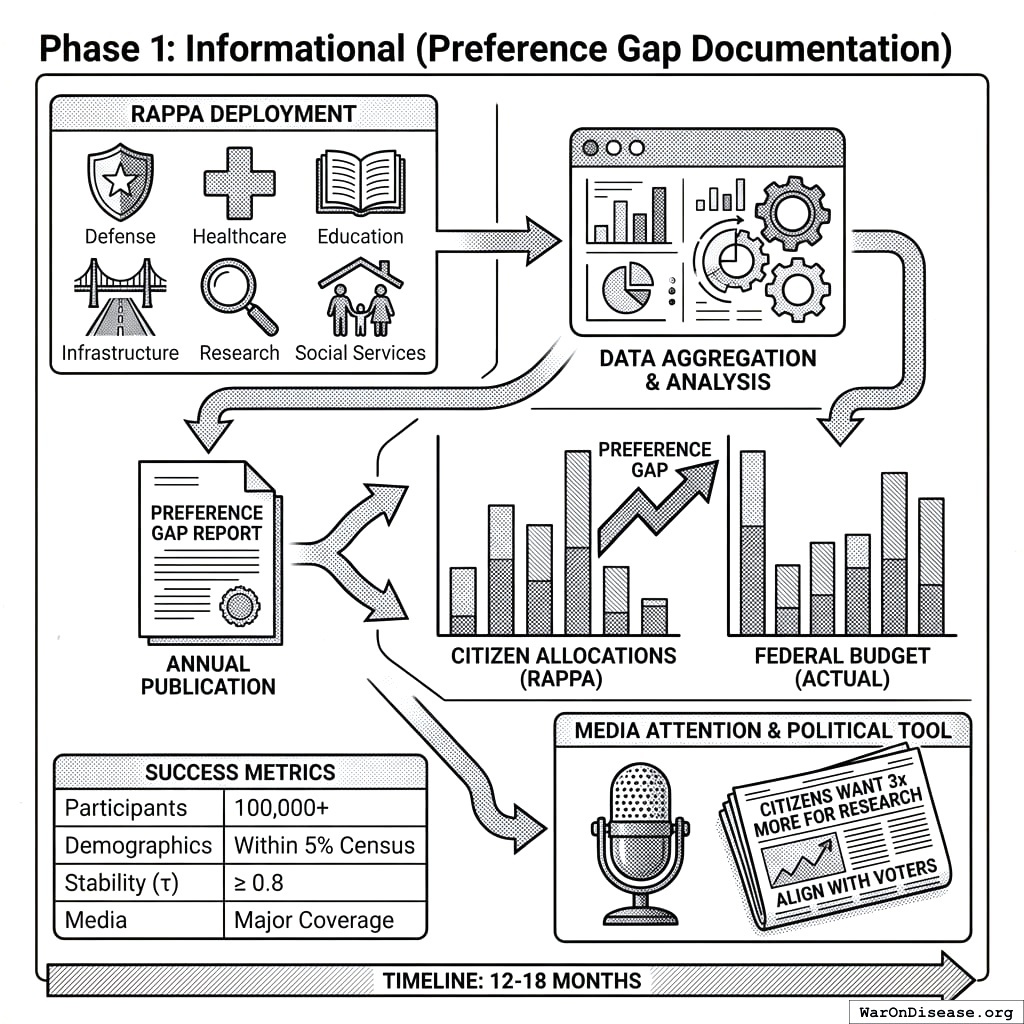 Why this works: Information alone won’t change policy, but it creates the foundation for Phase 2. The Preference Gap Report becomes a political tool: candidates can campaign on “aligning with citizen preferences” and opponents can be attacked for “ignoring what voters actually want.”