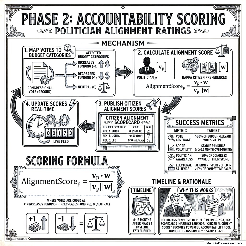 Objective: Create a public scoring system that rates elected officials based on how their voting records correlate with RAPPA-expressed citizen preferences.