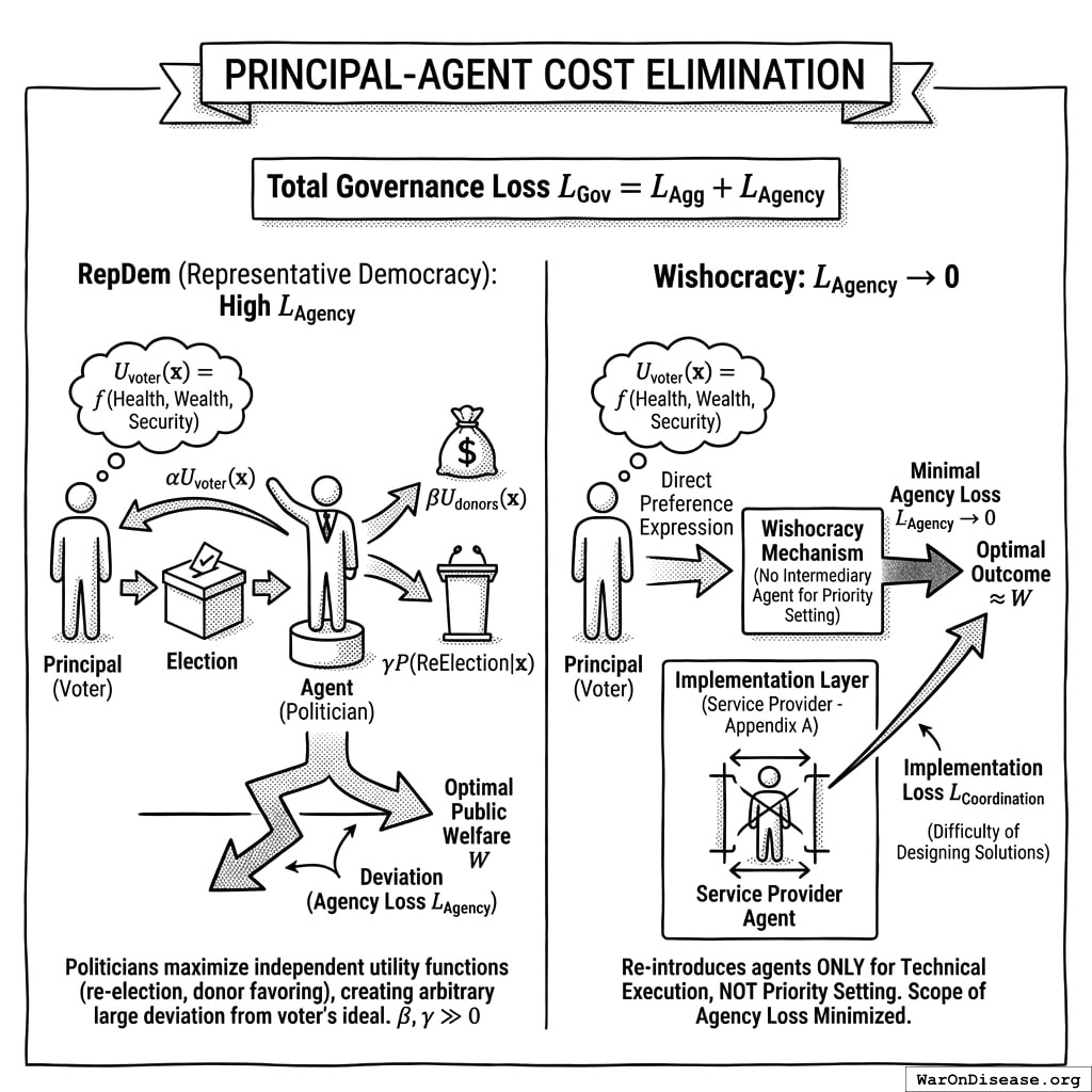Scale note. If that accountability layer works at system scale, the upside is civilization-scale rather than procedural. Under the project’s best-case governance ceiling, the recoverable upside is $101 trillion (95% CI: $83.3 trillion-$191 trillion) per year. Over 20 years, the Wishonian Optimal Governance Trajectory reaches 56.7x (95% CI: 19.3x-304x) the Earth baseline, raises average income to $1.16 million (95% CI: $395,118-$6.22 million) versus $20,483 on the status-quo path, and reaches $10.7 quadrillion (95% CI: $3.64 quadrillion-$57.2 quadrillion) in total output. This paper focuses on the citizen-preference and accountability layer of that plan; the full derivation lives in The Political Dysfunction Tax51.