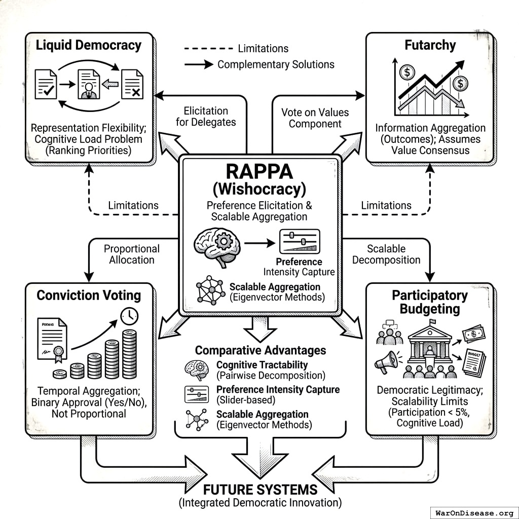 These mechanisms form a complementary toolkit. A governance system might use RAPPA to surface priorities across a large policy space, QV to allocate resources within categories, and traditional voting for final ratification.