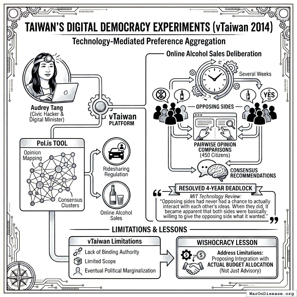 The empirical precedents from Porto Alegre’s participatory budgeting, Taiwan’s vTaiwan platform, and Stanford’s voting research demonstrate that citizens can and will engage productively with pairwise preference-expressing mechanisms. These real-world experiments validate the core assumptions underlying Wishocracy while revealing the institutional fragility of advisory mechanisms that lack connection to electoral incentives.