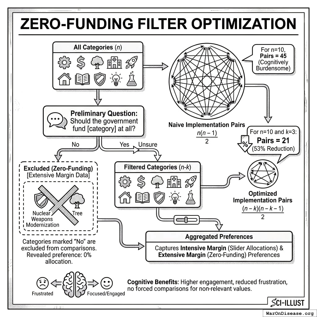 Wishocracy offers a fourth path: a mechanism that harnesses collective intelligence through structured preference elicitation while respecting cognitive constraints, incorporating preference intensity, and maintaining democratic legitimacy. By presenting citizens with simple pairwise comparisons (‘Given $100 to allocate between cancer research and Alzheimer’s research, how would you divide it?’), the mechanism decomposes the impossible n-dimensional comparison into tractable binary choices. Aggregated across millions of such comparisons from thousands of participants, the system converges on a preference ordering that approximates the utilitarian social welfare function under stated assumptions.