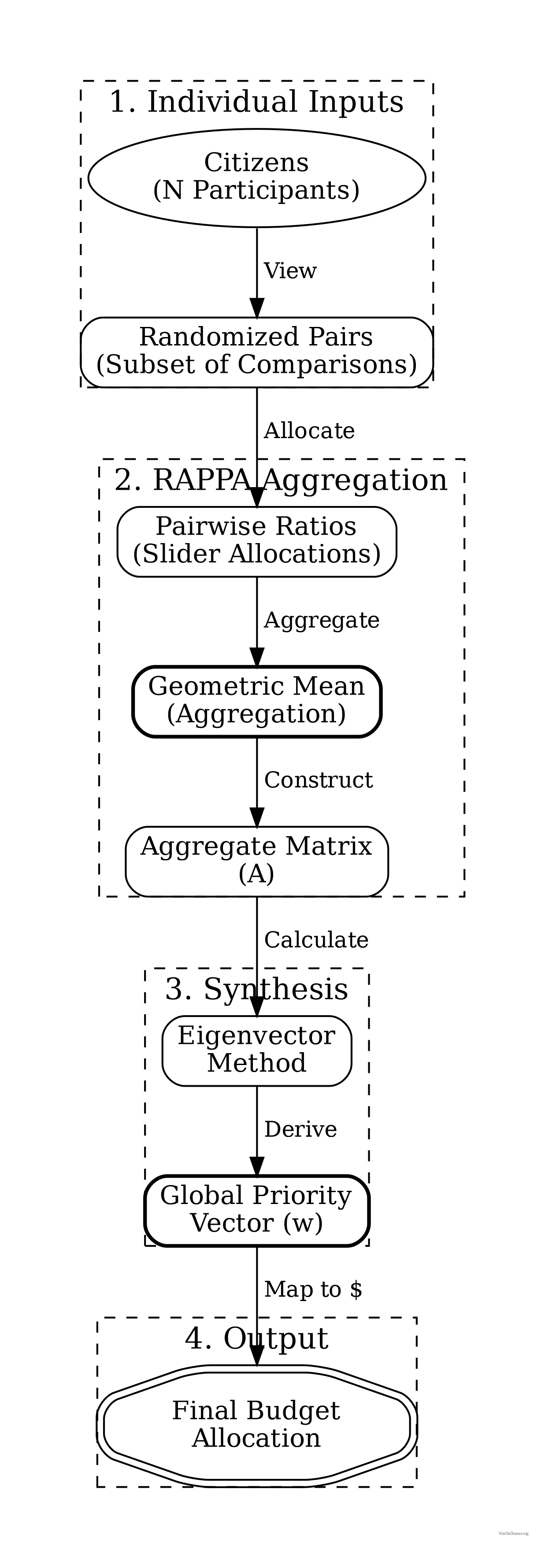 1. Cognitive Tractability: By decomposing n-dimensional budget allocation into pairwise comparisons (drawing on AHP), RAPPA respects the well-documented cognitive limit of \(7 \pm 2\) simultaneous comparisons, making participation feasible for all citizens regardless of education or available time.