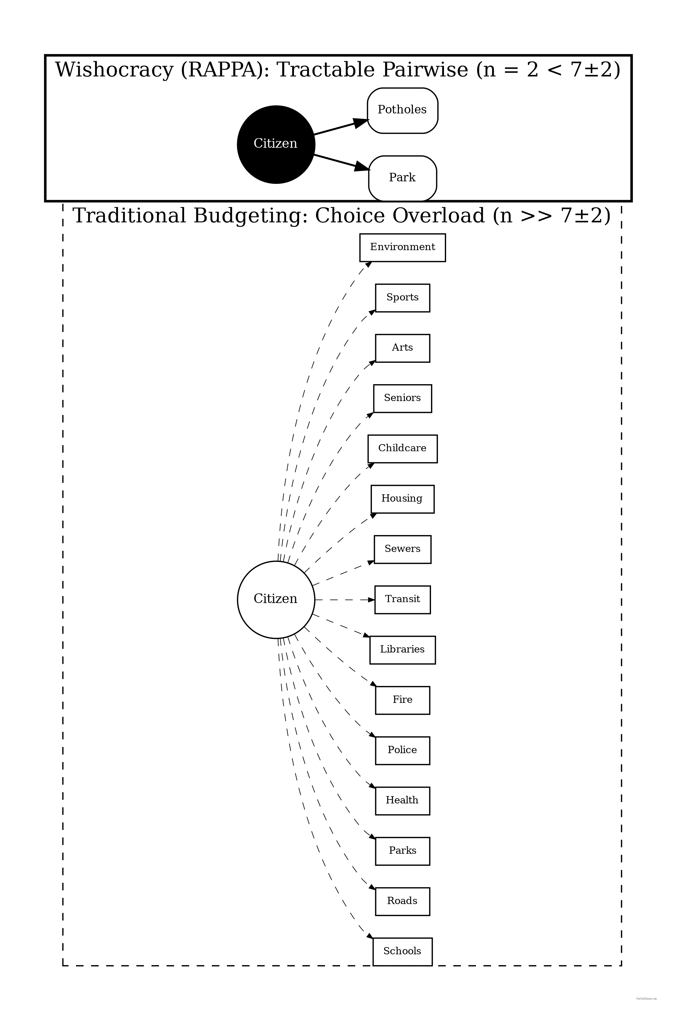 Wishocracy implies a separation of concerns: RAPPA determines what society values (the priority vector \(\mathbf{w}\)), while the implementation of those priorities is handled by a separate layer of competitive problem-solving organizations (see Appendix A: The Solution Layer). This distinction prevents the mechanism from bogging down in technical debates during the preference aggregation phase.