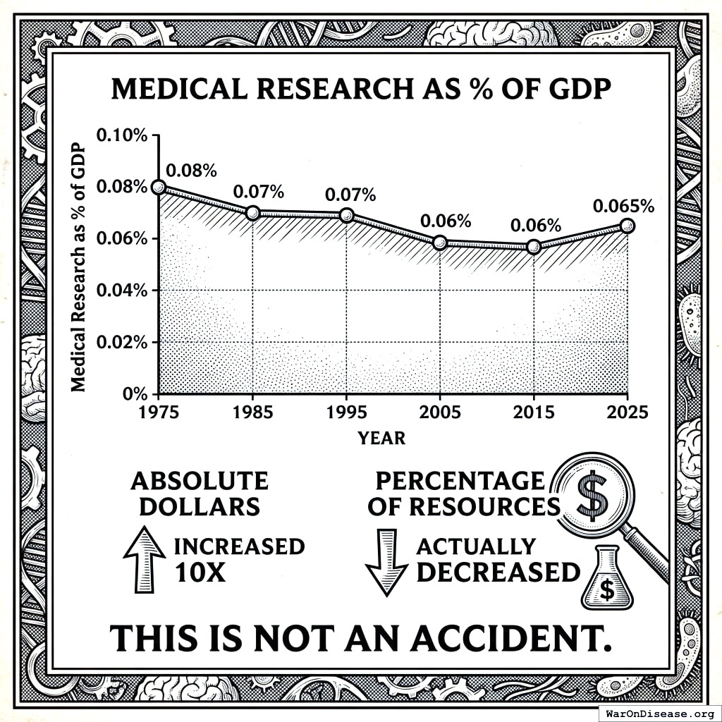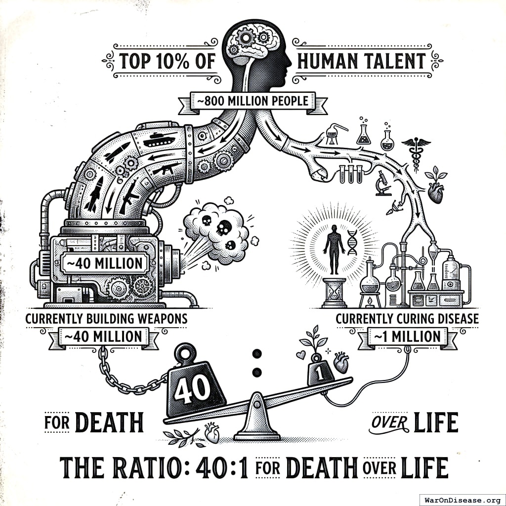 10.5281/zenodo.18161560 6.65 thousand diseases have zero FDA-approved treatments; at current trial capacity, exploring them takes 443 years. Redirecting 1% of military spending scales capacity 12.3x, cutting the timeline to 36 years and preventing 10.7 billion deaths. At $0.00177/DALY, 50.3kx more cost-effective than the best existing interventions. Incentive Alignment Bonds make adoption politically viable.