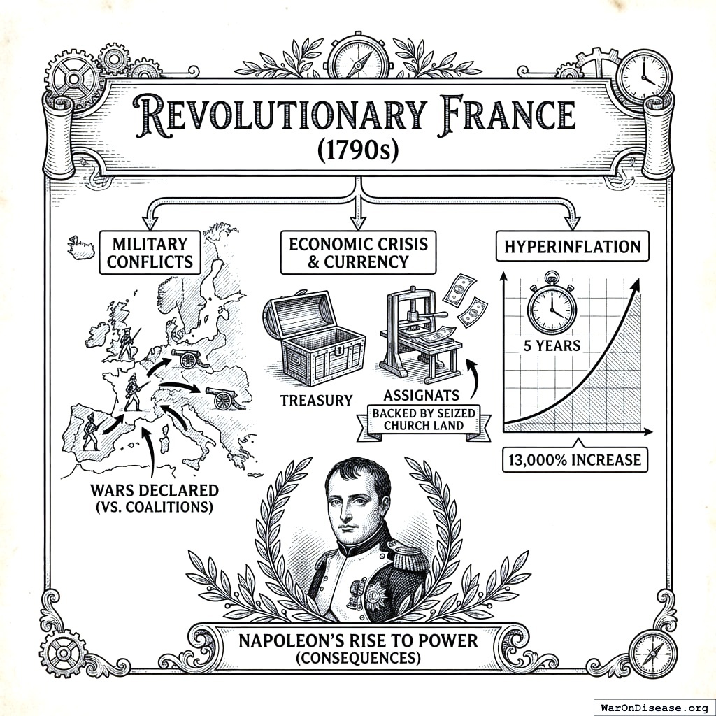 France started wars with everyone. Ran out of money. Invented a solution: print fake currency called “assignats” backed by church land they’d stolen. Backing money with stolen property is surprisingly honest about what money is.