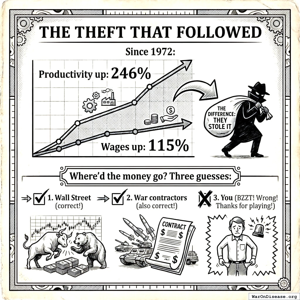 “But what about Canada?” says the human who took one semester of economics. “What about Norway? They have central banks and no dictators.” Correct. Well observed. You have identified two countries where the money printer has not yet produced a dictator, in the same way that a smoker who hasn’t yet gotten cancer has “disproved” the link between smoking and cancer. Canada’s dollar has lost over 95% of its purchasing power since 1913. Norway’s krone has lost over 98%. The median Canadian and Norwegian are poorer in real terms than the numbers suggest, and the gap between productivity and wages has opened in every country with a fiat currency since the 1970s. Every single one. The dictator is the dramatic version. The quiet version is a 93% pay cut delivered so gradually that you blame yourself for not saving enough. Both versions use the same printer. One just has better manners. On Wishonia, we do not judge a parasite by whether the host is still walking. We judge it by how much blood is missing.
