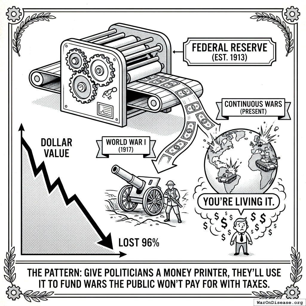 Every war on this list required printing money, debasing currency, or borrowing from a central bank that created the money from nothing. In each case, the printer removed the inconvenient step of asking citizens whether they would like to pay for it.