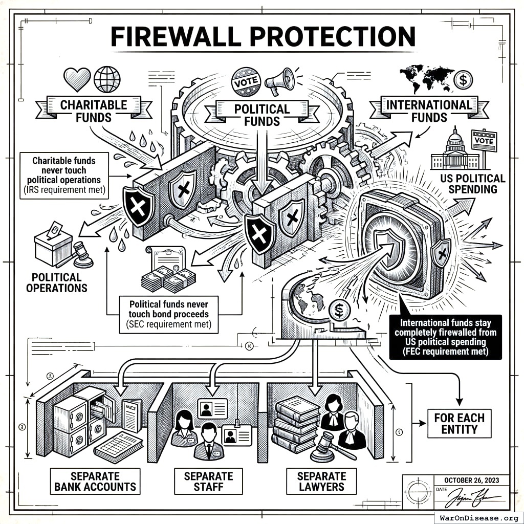 The firewalls matter more than the entities themselves. Charitable funds never touch political operations (the IRS is watching). Political funds never touch bond proceeds (the SEC is watching). International funds stay firewalled from US political spending (the FEC is watching). Separate bank accounts, separate staff, separate lawyers. Everyone watches everyone. This is called “compliance” and it’s the most expensive form of distrust your species has invented, which is saying something, because your species has invented a lot of expensive distrust.