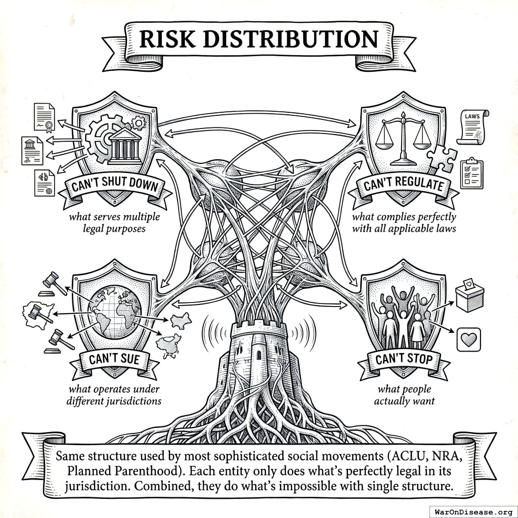 Redundancy: The Sword is naturally multi-node because campaign law is jurisdictional. You need a different legal entity in every country: a US 501(c)(4), an EU-equivalent advocacy organization, separate entities in every major democracy. Multiple Swords compete for bondholder capital to run the most effective campaign in their territory. Each Sword owns its jurisdiction clearly; its revenue depends on treaty passage in that territory, so the incentive to perform is direct and the ownership is unambiguous. A bad Sword loses bondholder capital to a more effective one in the same jurisdiction, the way a bad advertising agency loses clients. No tragedy of the commons because nobody is responsible for “the whole world.” Everyone is responsible for their own country.