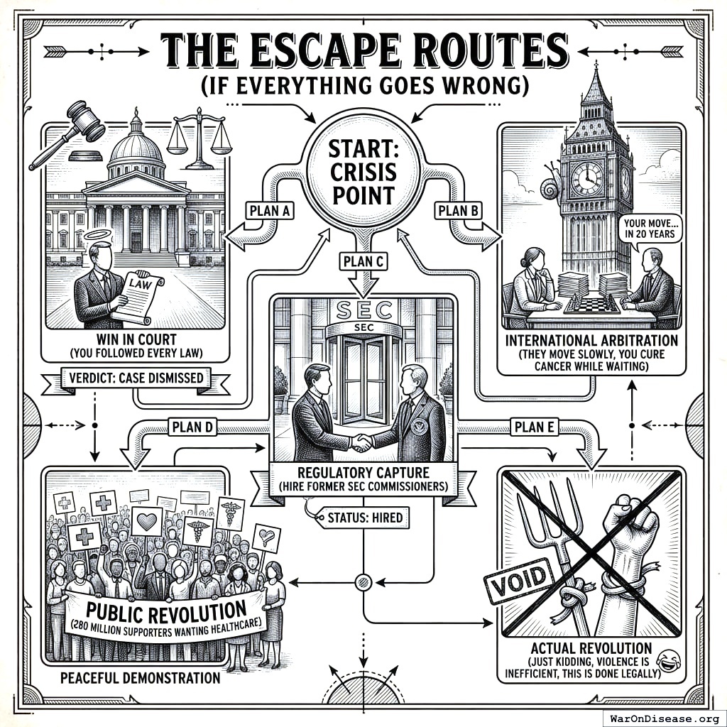 If the courts fail anyway, you have international arbitration, regulatory capture (former SEC commissioners are surprisingly affordable, like vintage furniture), and 280 million referendum participants who make politicians reconsider their entire careers.