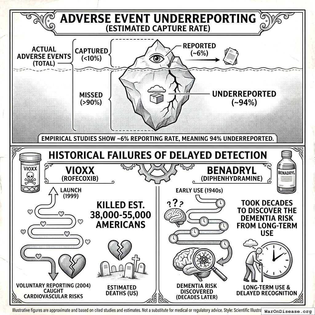 After approval, the FDA monitors safety using FAERS, a system where doctors voluntarily report problems if they feel like it. It captures less than 10% of actual adverse events162. Vioxx killed an estimated 38,000-55,000 Americans163 before this honor system noticed. That’s more people than died in the entire Korean War, detected by a system that relies on doctors filling out optional paperwork. I want to be clear: the 8.2 years (95% CI: 4.85 years-11.5 years) delay is supposed to be for safety. And then the safety monitoring after approval is a suggestion box. You waited 8.2 years (95% CI: 4.85 years-11.5 years) to get to the suggestion box.