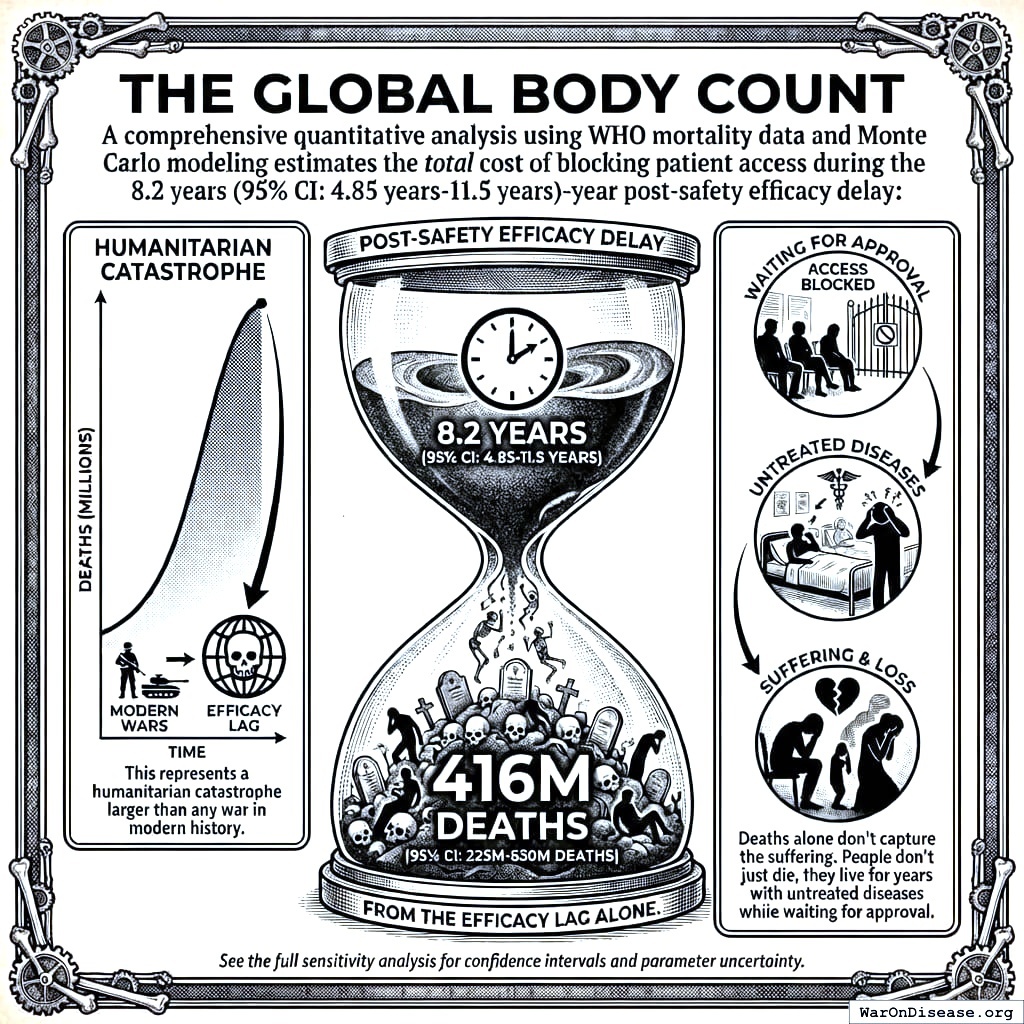 Economists call it “drug lag,” which is a lovely, clinical way of saying “people rotting to death in a queue for drugs that have already been confirmed not to hurt them.” Early estimates: 21,000 to 120,000 American lives per decade148. But that was just the US.