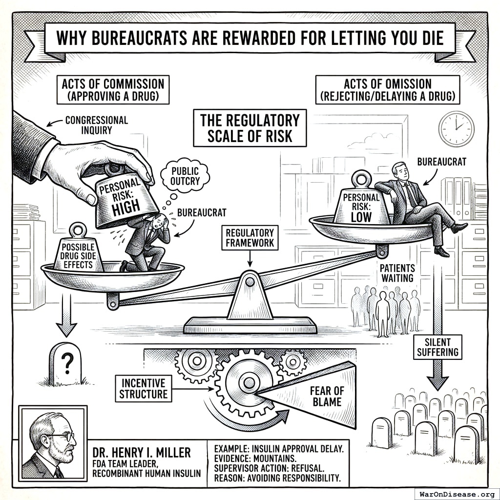 Dr. Henry I. Miller ran the FDA team reviewing recombinant human insulin in the early 1980s. Mountains of evidence showed it was safe and effective. His supervisor refused to approve it. If someone died from the drug, heads would roll. If people died waiting for the drug? Nothing happens.