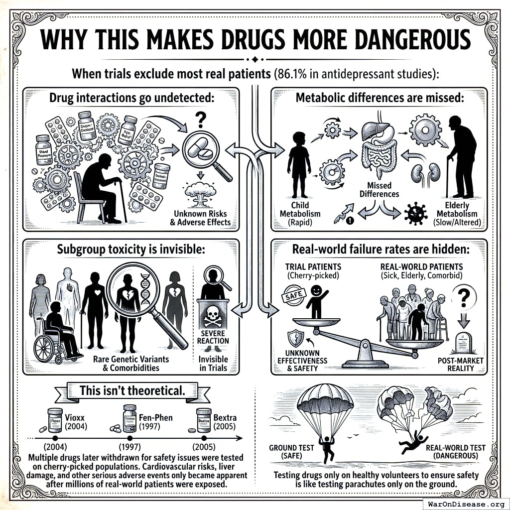 Result: In antidepressant trials alone, 86.1% of real patients are excluded. The drugs are tested on the healthiest people alive, declared “safe and effective,” then handed to everyone the trial specifically avoided. Nobody knows whether the drug works for those populations, what the interactions are, or what the real adverse event profile looks like. This is how Vioxx, Fen-Phen, and Bextra all got approved, celebrated, prescribed to millions, and then withdrawn after killing people whose demographics the trials had carefully excluded. The 8.2 years (95% CI: 4.85 years-11.5 years) delay didn’t make these drugs safer. It made them seem safer by hiding the danger behind an exclusion list.