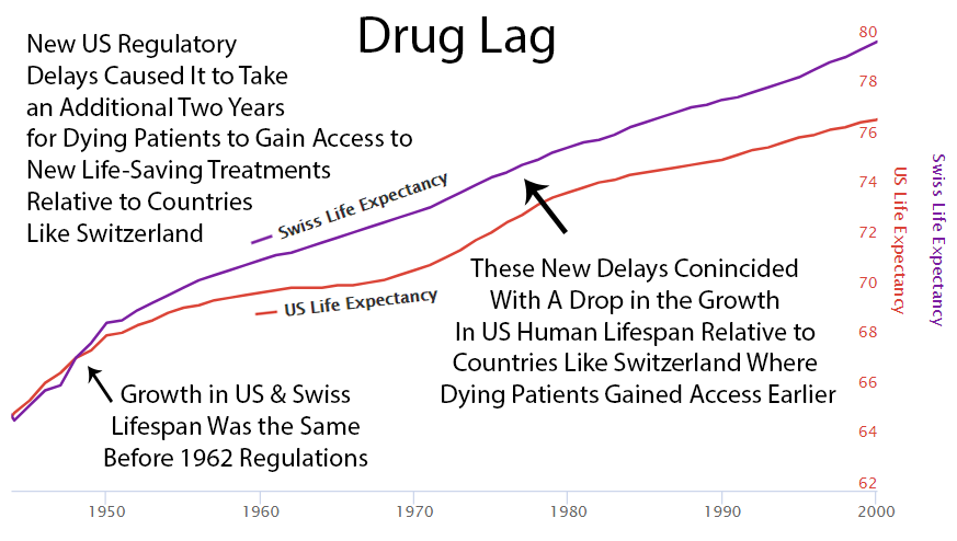 Phase I safety testing (added in 1938) prevented all US thalidomide deaths while Europe had thousands. So in 1962, Congress looked at a system that was working and thought, “What if we made this much worse?” They added massive pre-approval efficacy requirements via the Kefauver Harris Amendment147, blocking patient access for years during testing.