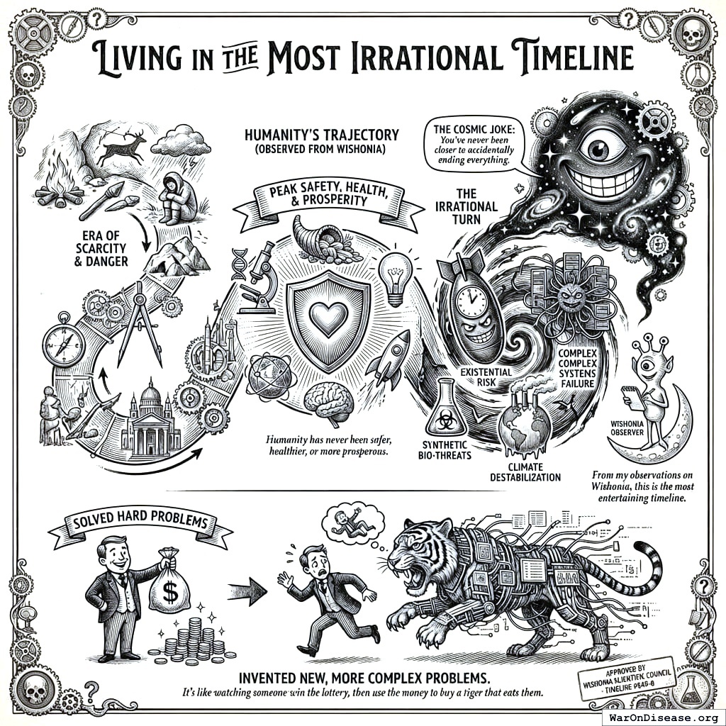 You can feed everyone twice over, but you’d rather burn grain to keep prices high. You can cure diseases, but you’d rather sell treatments forever (cured customers don’t come back; bad for quarterly earnings). You could be immortal space wizards. Instead you’re cave-dwelling murderers with better tools. Because the current system makes irrationality profitable. Spectacularly profitable. Every bomb makes someone rich. Every missile funds a yacht. Every war creates a billionaire. Disease is profitable too. Not curing it, treating it. Insulin costs $300 a vial161 because dead diabetics don’t buy insulin. But cured diabetics don’t either. So you keep them barely alive. It’s good business. On Wishonia, “good business that requires people to suffer” has a different name. The name is “crime.” But on your planet, it’s a quarterly earnings call.