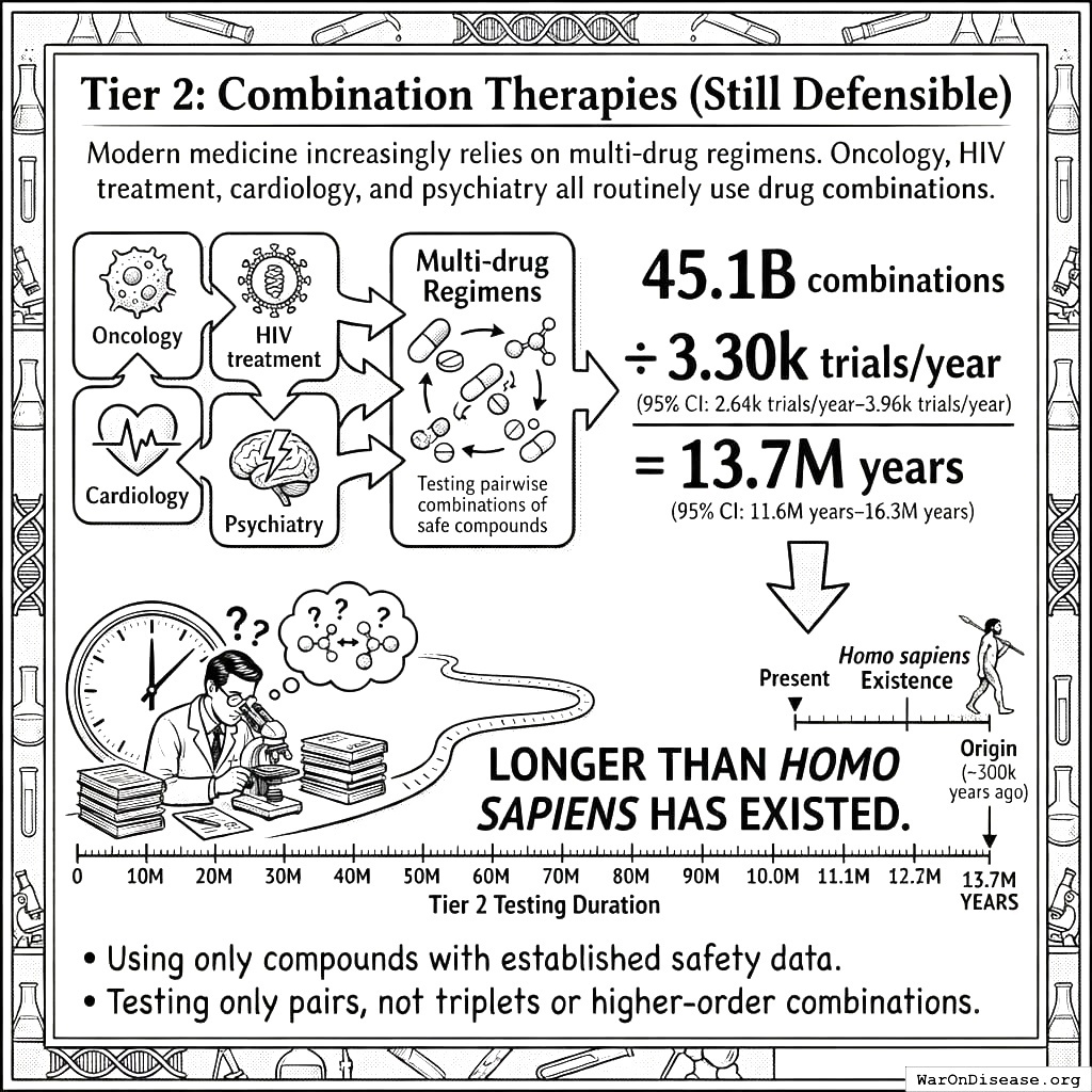 That’s longer than Homo sapiens has existed as a species. You would need to have started testing drug combinations before your ancestors climbed down from the trees, and you still wouldn’t be done. And that’s only pairs. If you want triplets, you’ll need to outlive the sun.