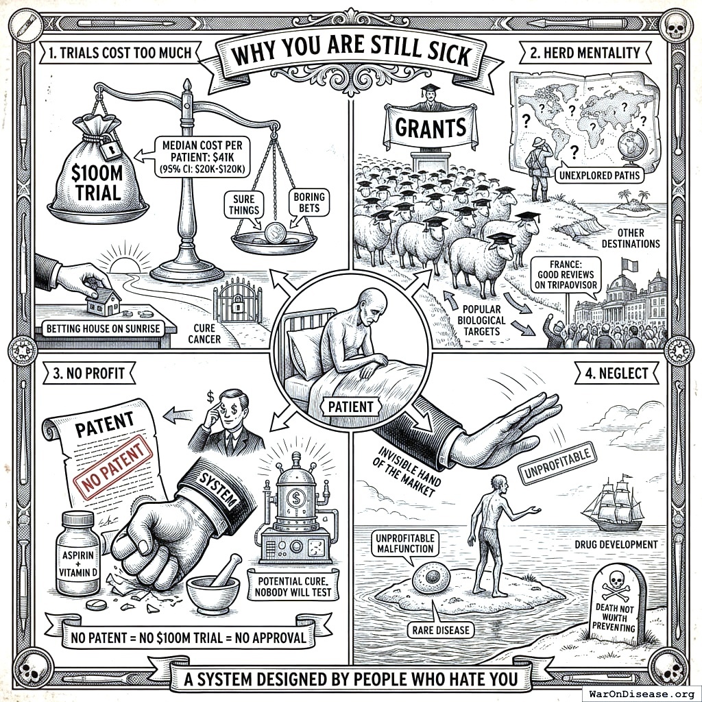 The ticket price is insane. A typical Phase II-III trial costs $30-$100M (median cost per patient $41,000 (95% CI: $20,000-$120,000)). At that price, you only test things pharmaceutical companies can patent and sell at enormous markups. Everything else sits untested. Imagine a dating app where each date costs $100 million and only billionaires are allowed to swipe. That’s your drug approval system. The molecules without money die alone.